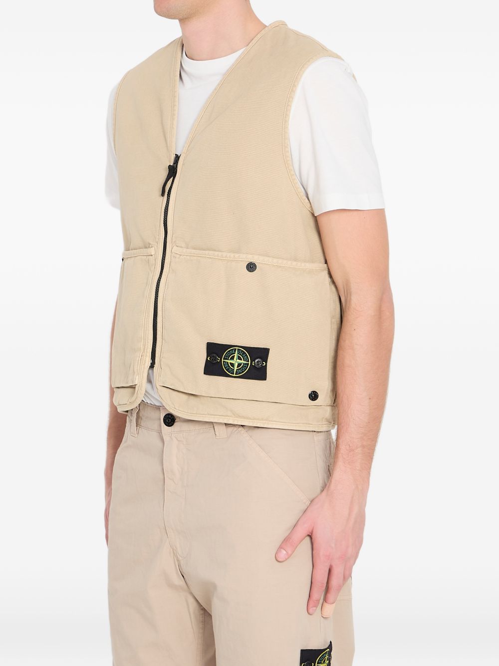 Beige 6100007 vest by Stone Island in cotton with front bellows pockets with snap buttons at the top and on the side.