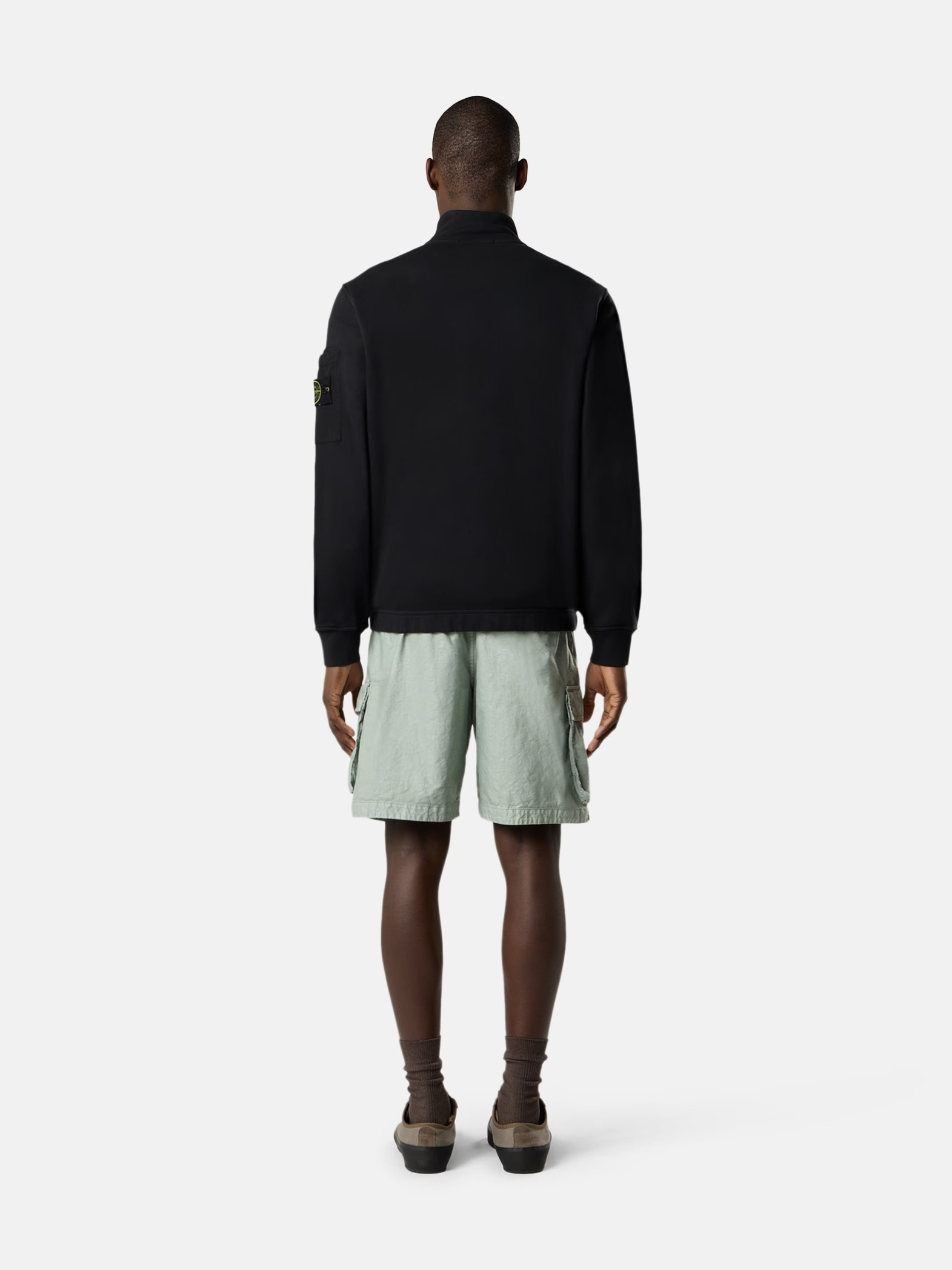 Black Stone Island cotton sweatshirt with high collar, front zip closure, long sleeves, side pockets, badge, and ribbed hem and cuffs.