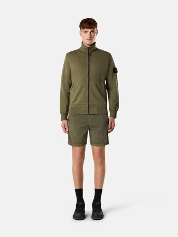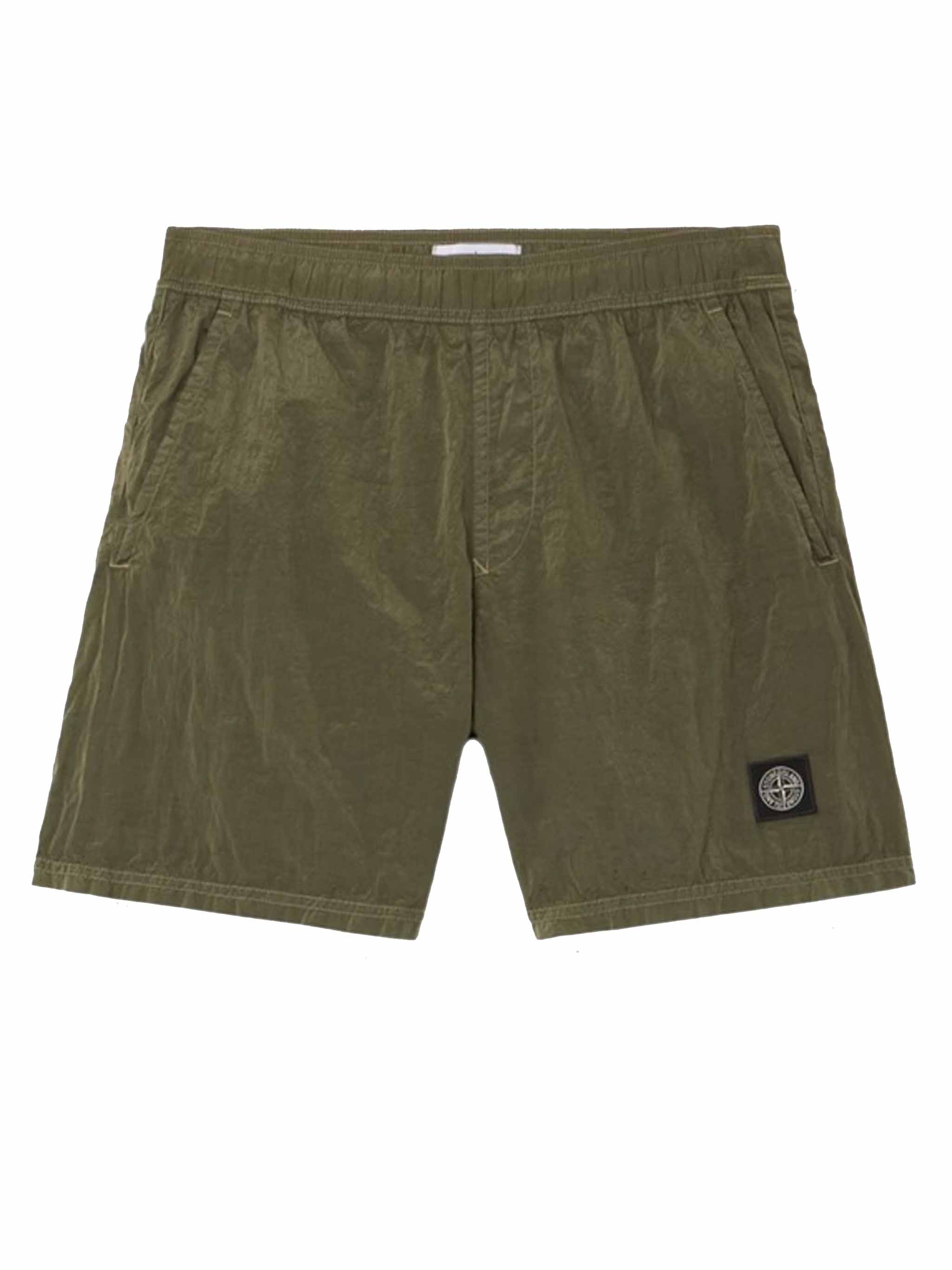 Stone Island B100004 shorts with drawstring waist, side pockets, badge, and straight hem.