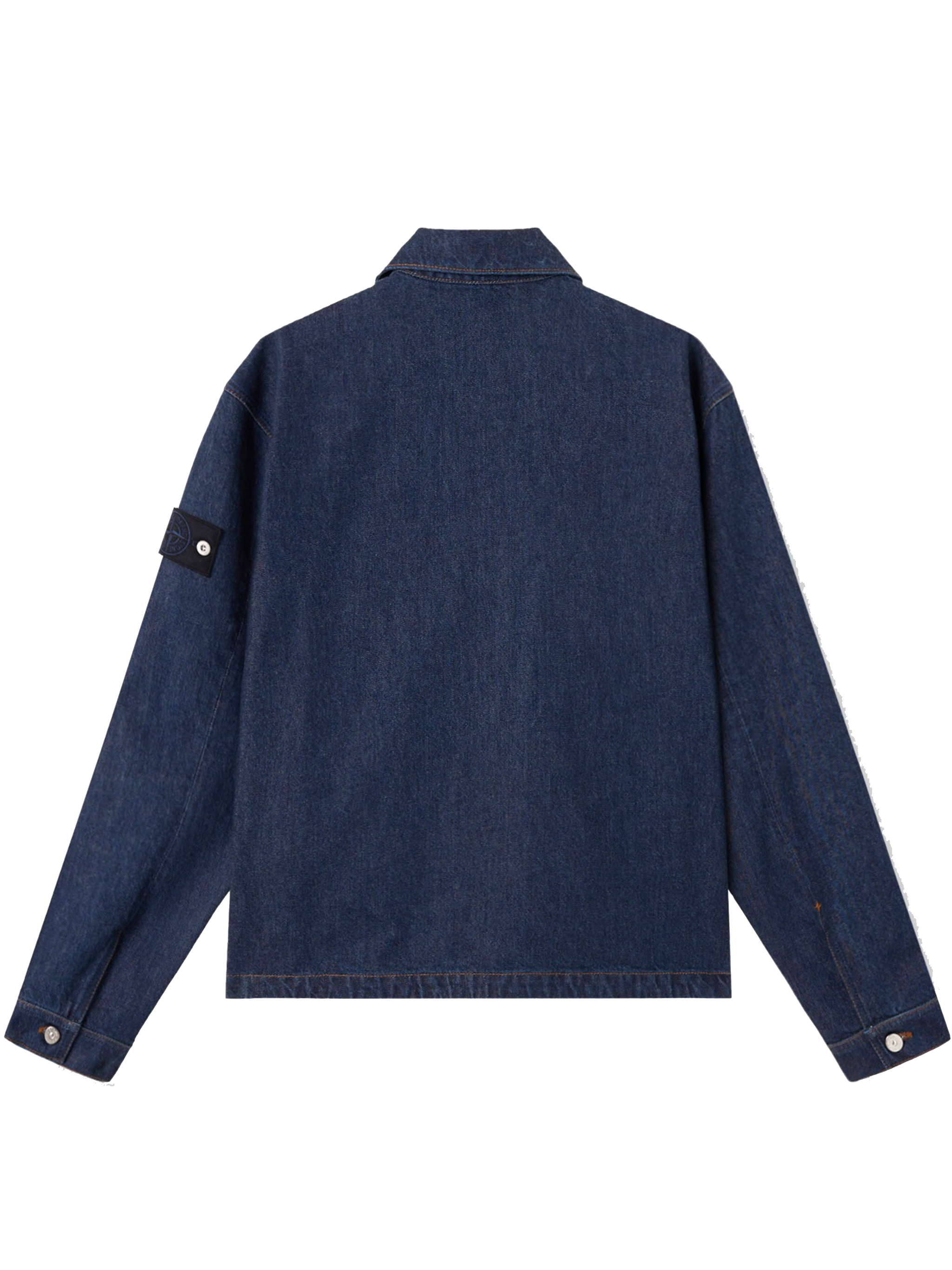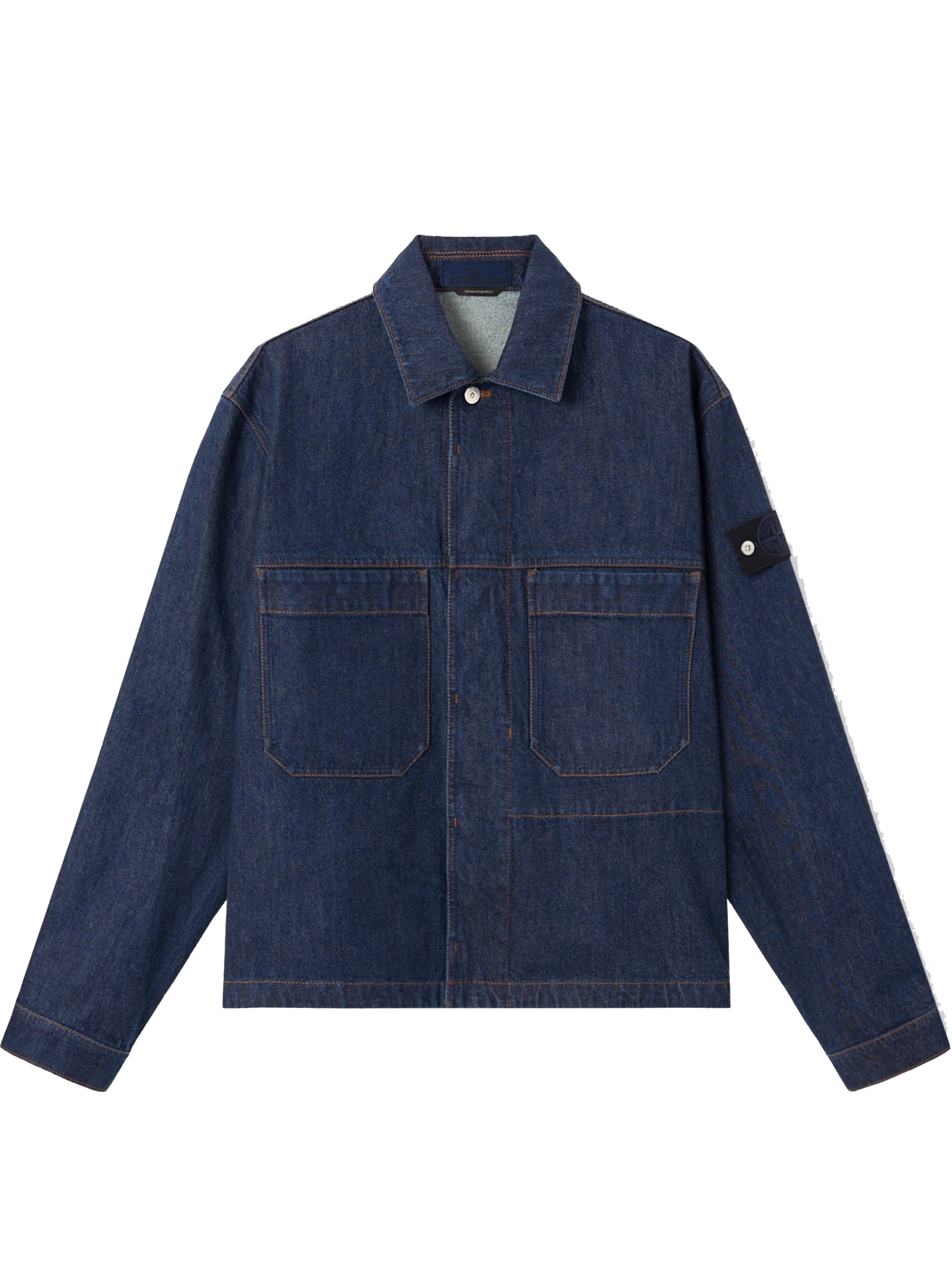 Stone Island blue jacket in cotton denim with classic collar, concealed front closure with chest pockets and Stone Island Denim Research badge, and straight hem.