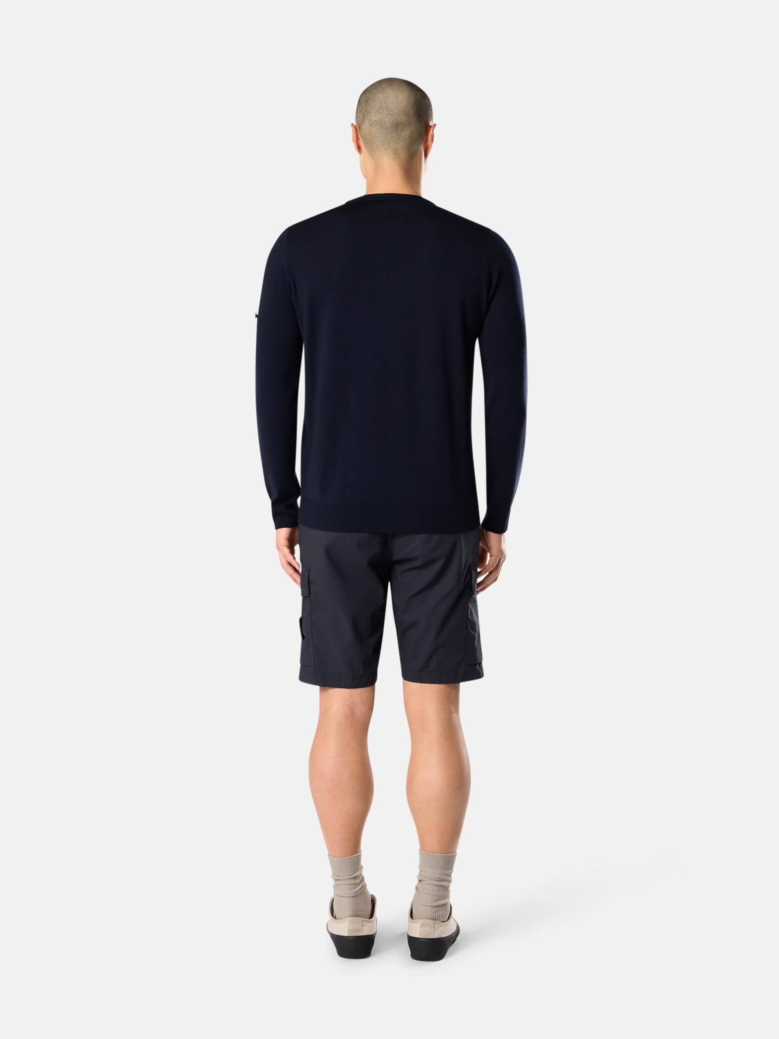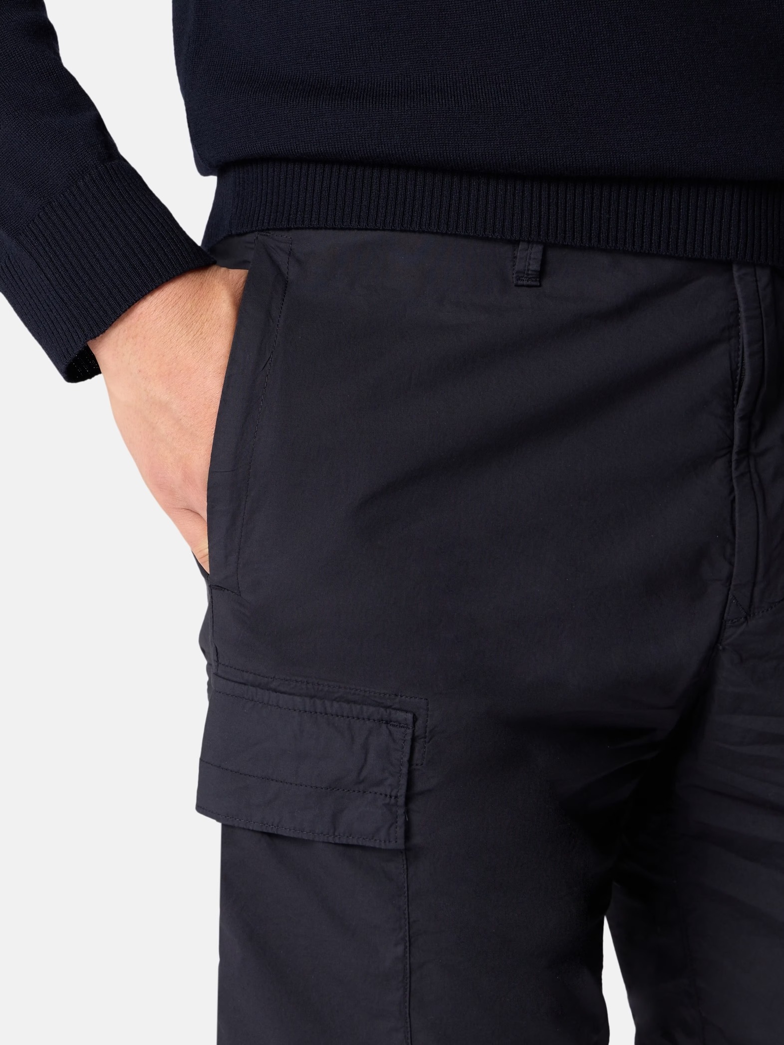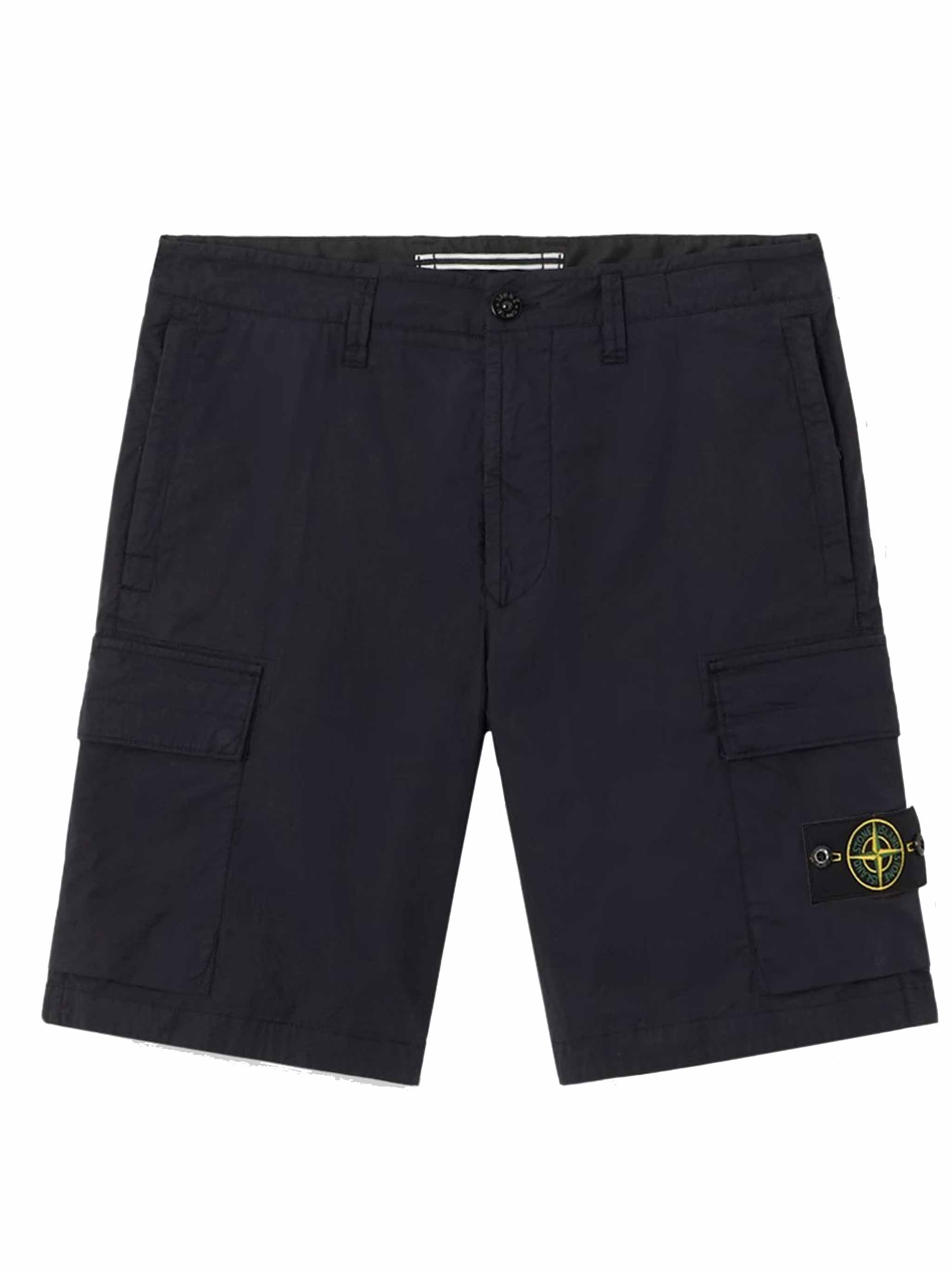 Stone Island L100020 shorts with hidden zip pockets, cargo pockets with flaps, and back pocket with snap button.