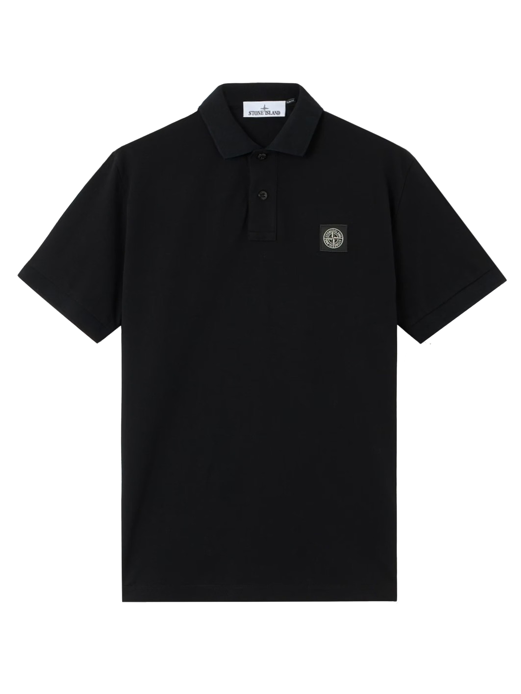 Stone Island black cotton polo shirt with classic collar, logo label, short sleeves, and straight hem.