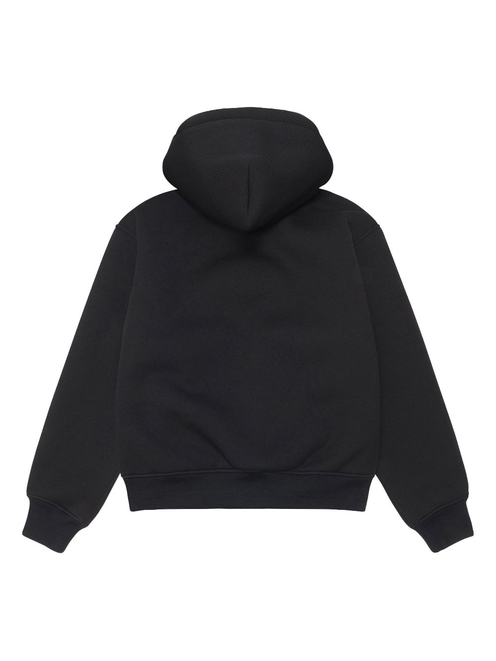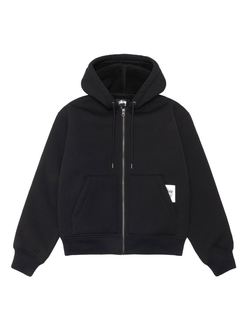 Relaxed fit sweatshirt with zip and side pockets, sherpa lining, round drawstring in the hood.