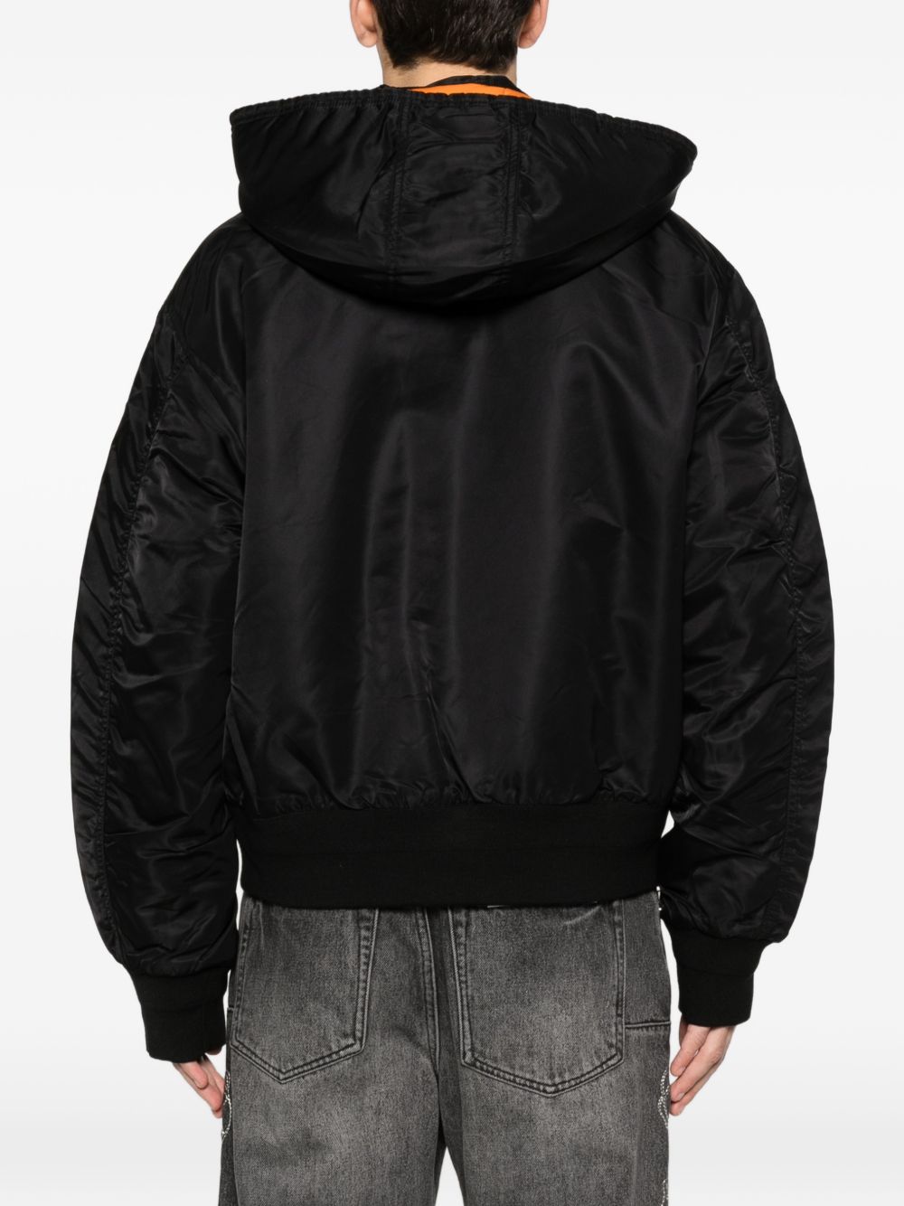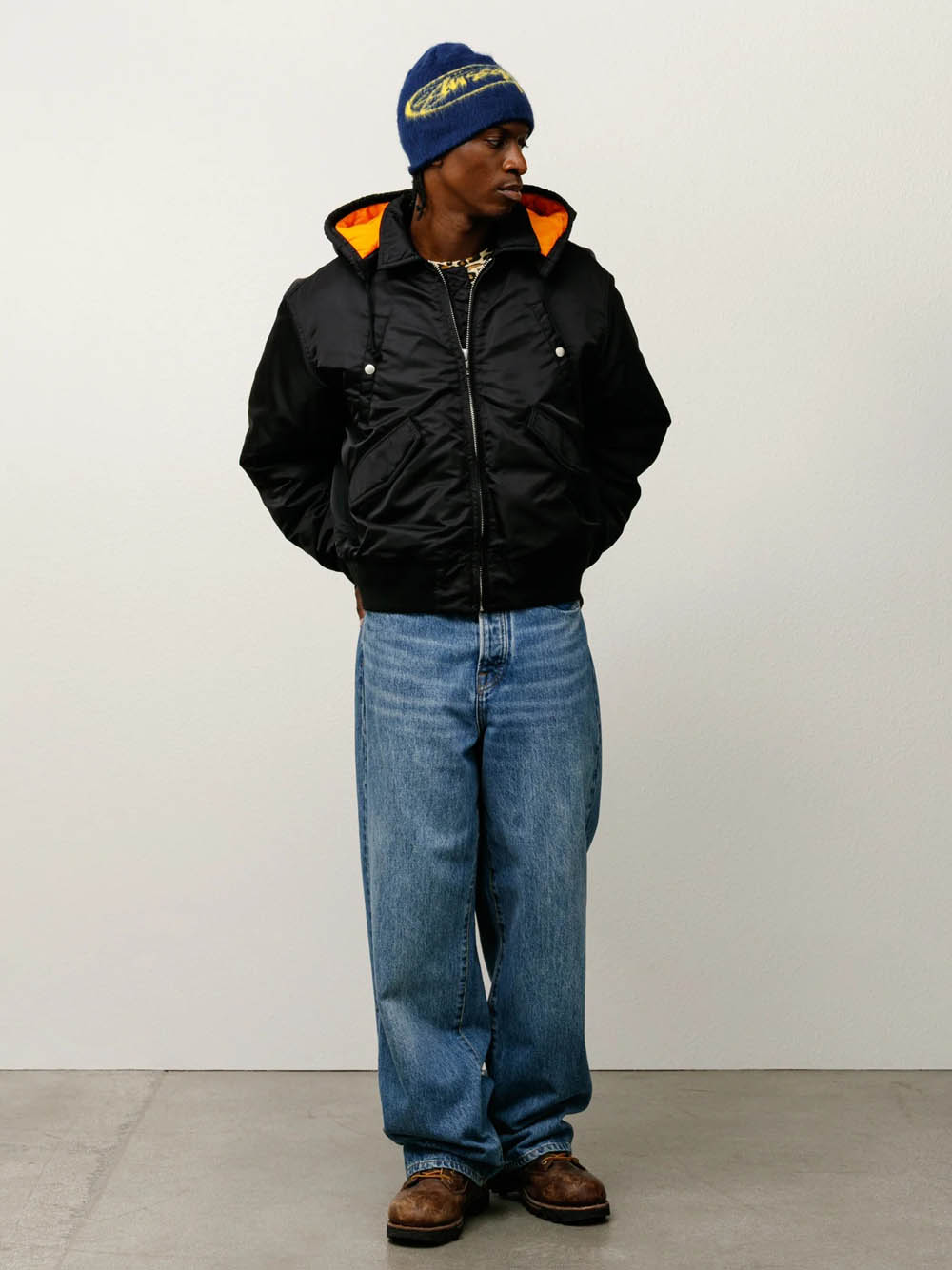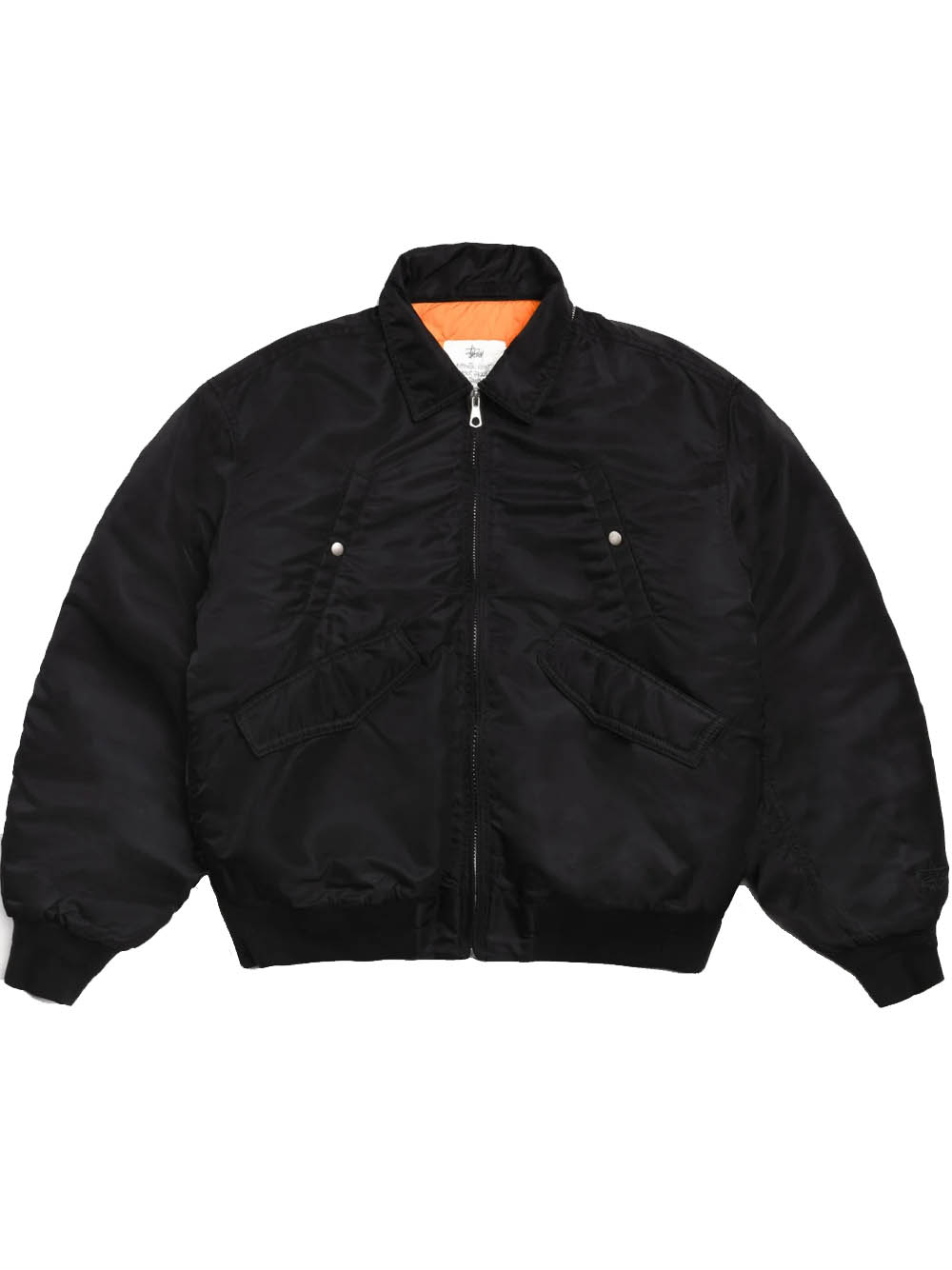 Loose-fitting bomber jacket in CORDURA® flight satin, fully padded with quilted lining, detachable hood with drawstring, metal zip closure, quilted zip protection, welt pockets on the chest with metal snap buttons, slanted pockets with flaps and hidden snap buttons, basic Stüssy logo embroidered in the same color on the left sleeve, ribbed cuffs and hem, hanging loop inside the collar, internal patch pocket with Velcro closure.
