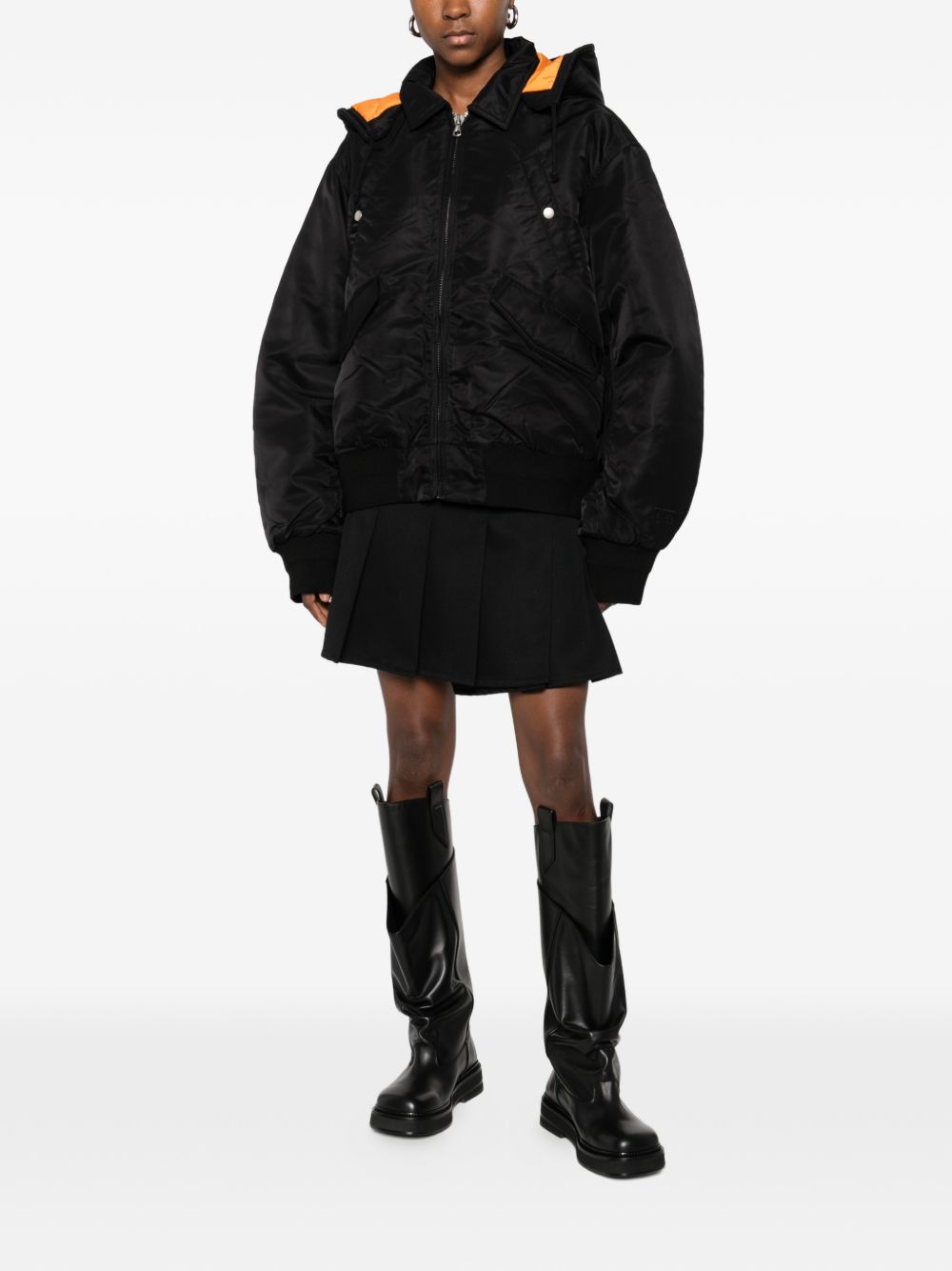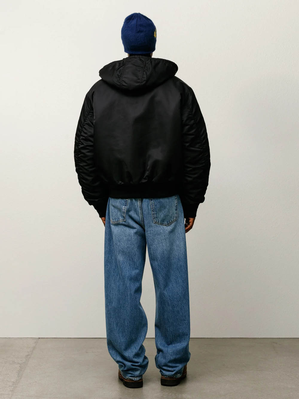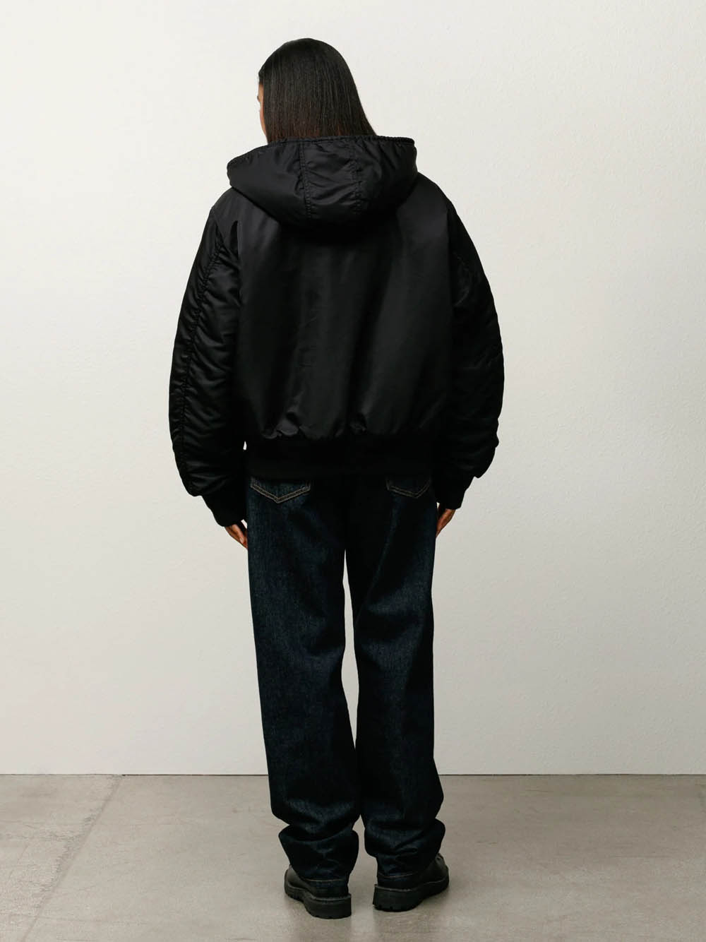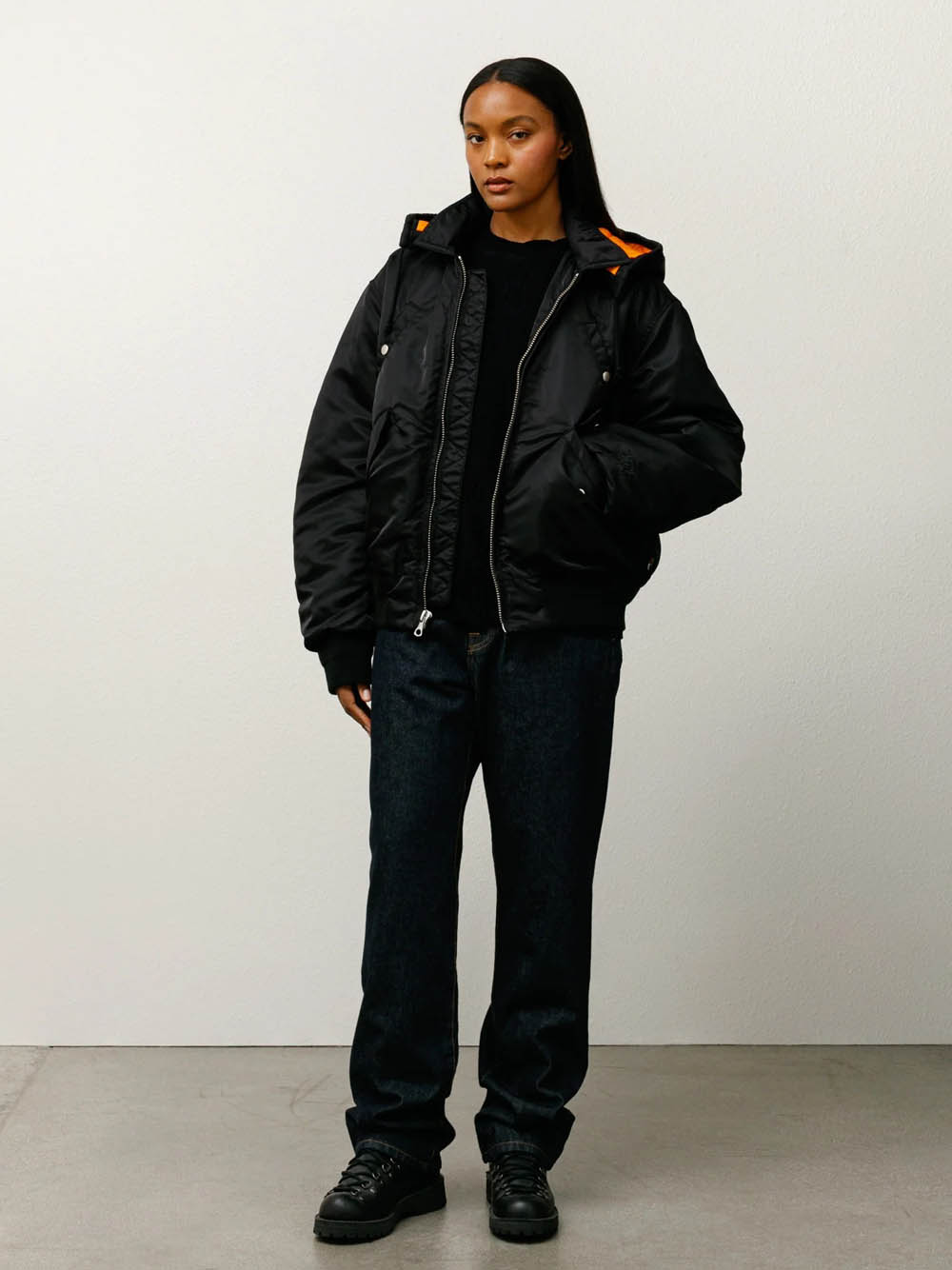Loose-fitting bomber jacket in CORDURA® flight satin, fully padded with quilted lining, detachable hood with drawstring, metal zip closure, quilted zip protection, welt pockets on the chest with metal snap buttons, slanted pockets with flaps and hidden snap buttons, basic Stüssy logo embroidered in the same color on the left sleeve, ribbed cuffs and hem, hanging loop inside the collar, internal patch pocket with Velcro closure.