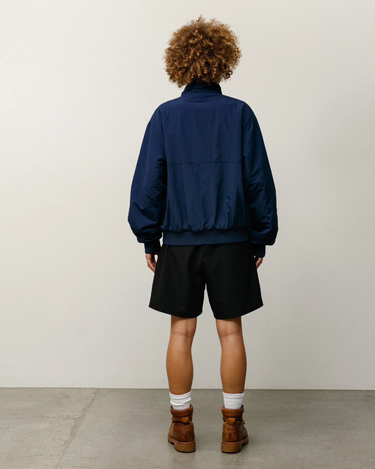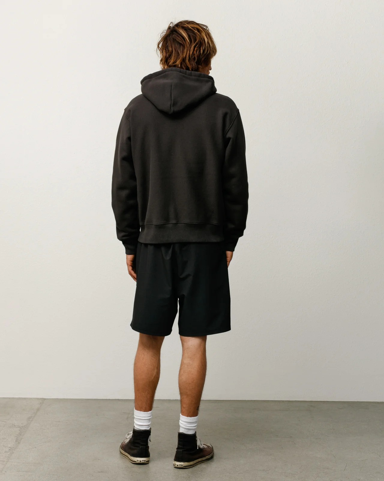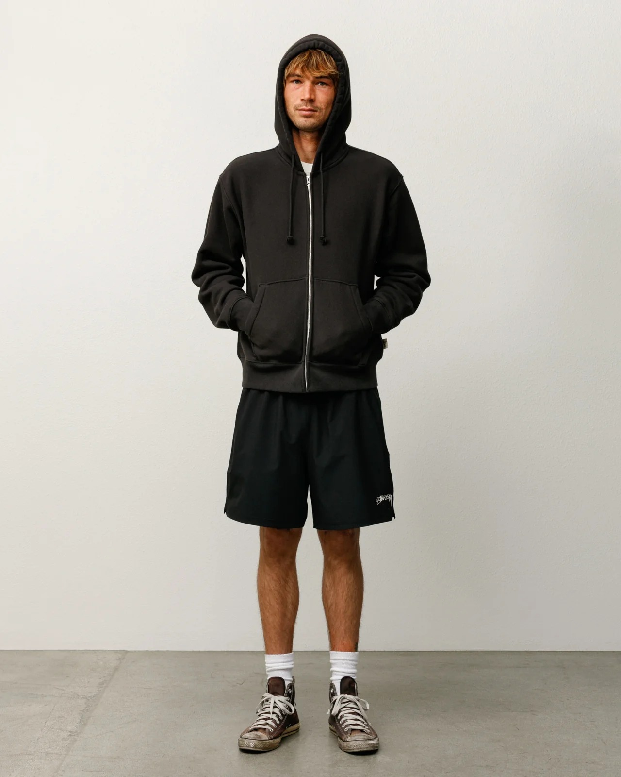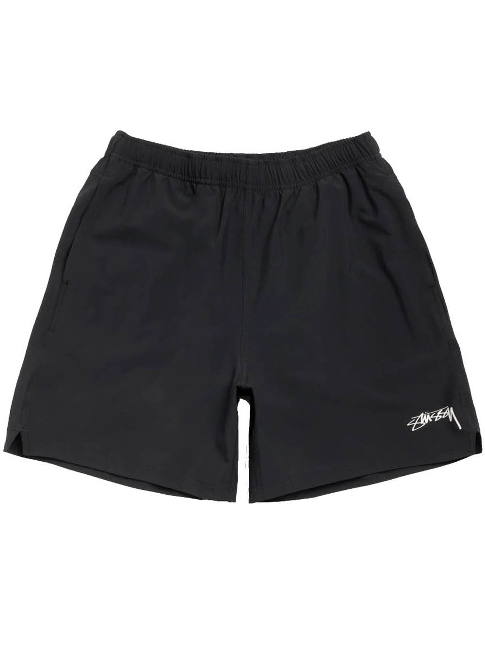 Classic-fit shorts made from four-way stretch technical fabric, featuring an elastic waistband with an internal drawstring, side seam pockets with mesh inserts, a solid-color printed Stüssy logo on the left leg, side slits at the hem, and an unlined back welt pocket with a zipper closure.