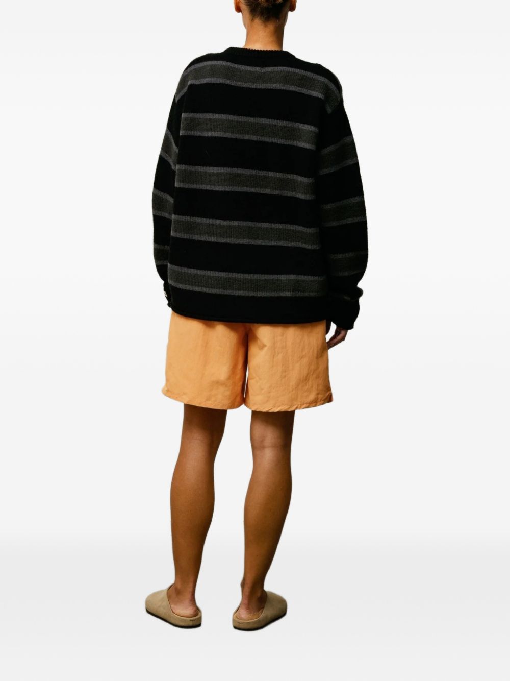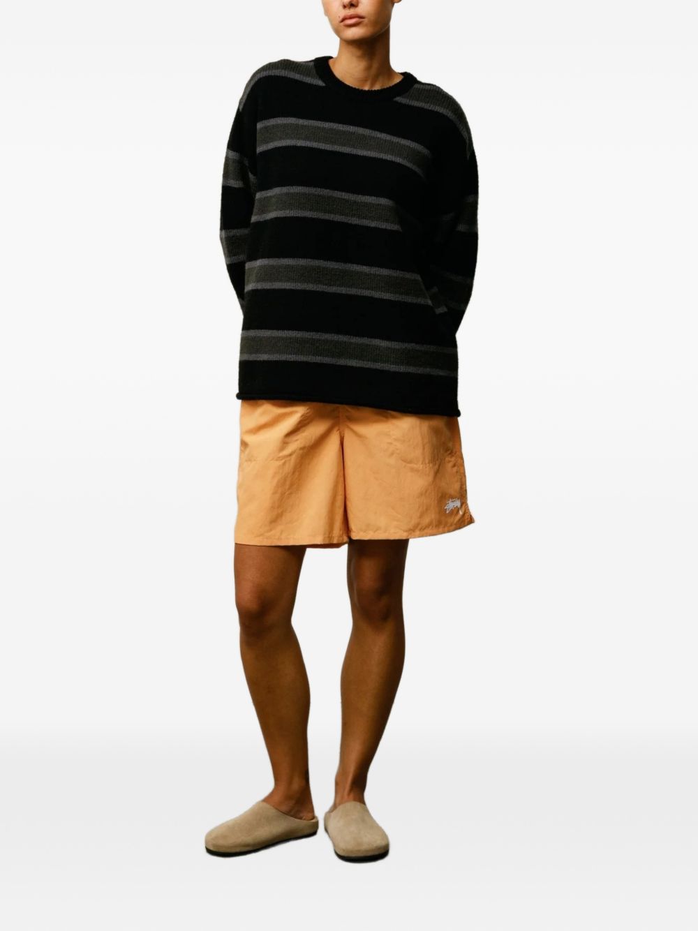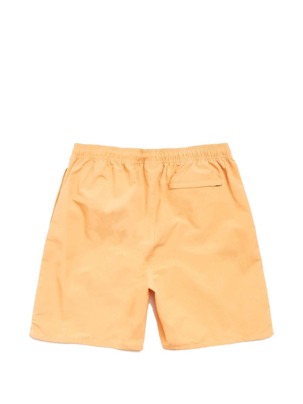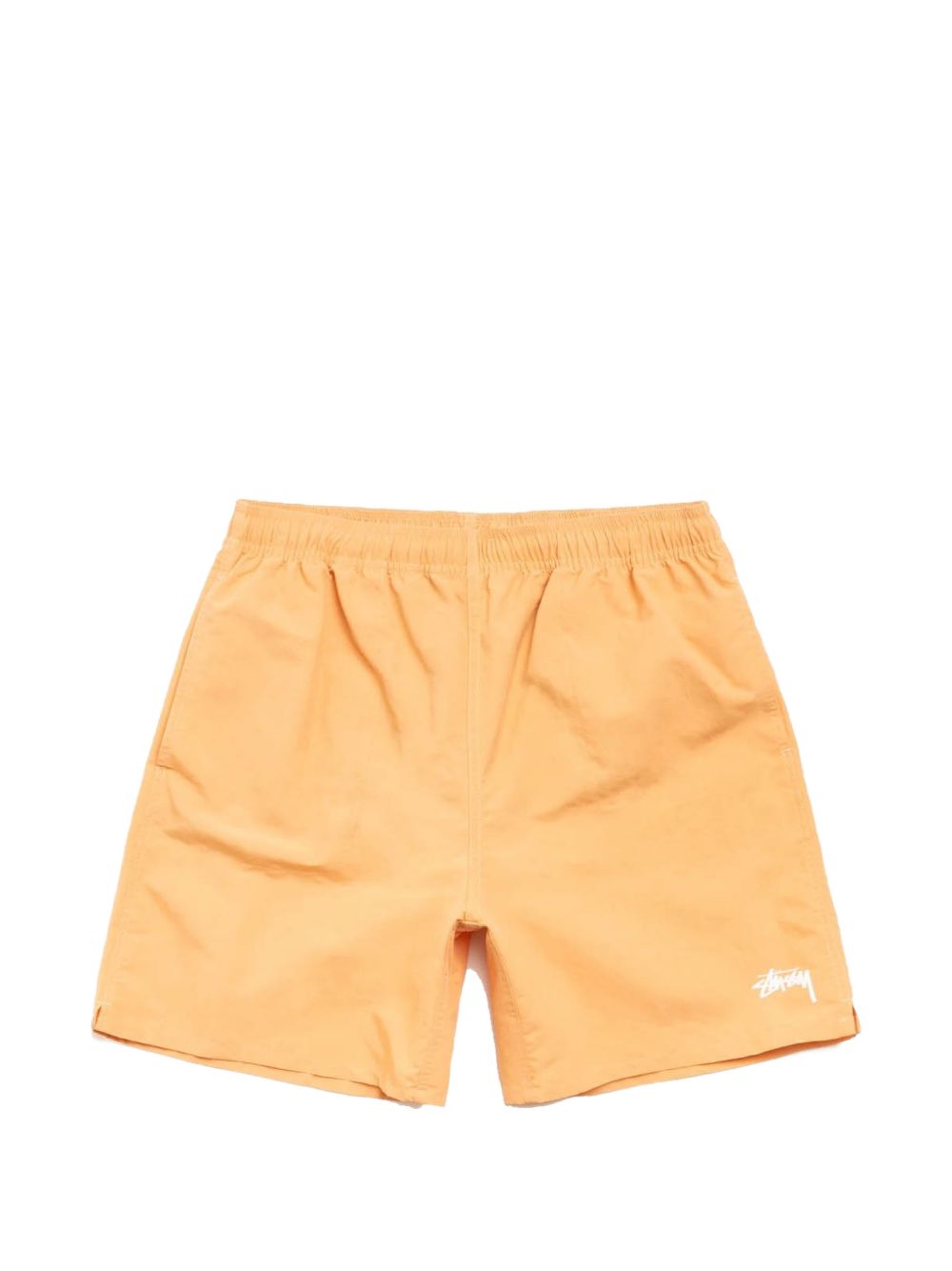 Classic-fit nylon swim shorts with an elastic waistband and internal drawstring, featuring the Stüssy logo printed on the left leg. Side seam pockets with reinforced bottoms, a back welt pocket with a zipper closure, and a mesh liner.