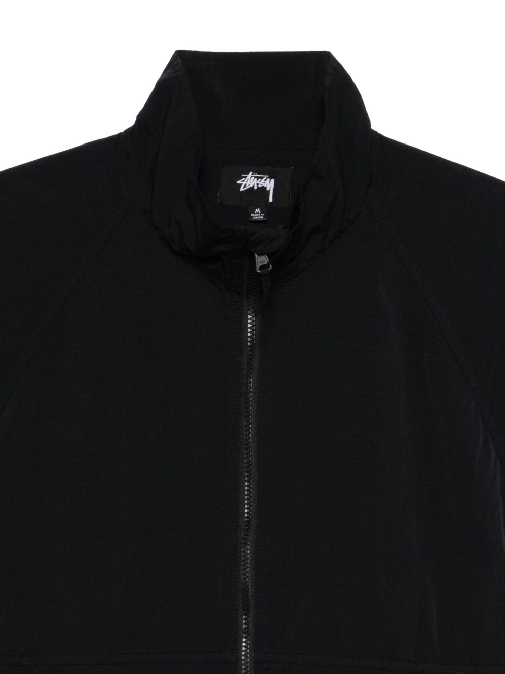 Relaxed shell jacket, ripstop nylon, raglan sleeves, YKK VISLON® zipper closure with protection, elastic cuffs with adjustable Velcro tabs, hidden zippered welt pockets, adjustable drawcord at the hem, tone-on-tone Stüssy logo printed on the back. Back vent with internal mesh panel.