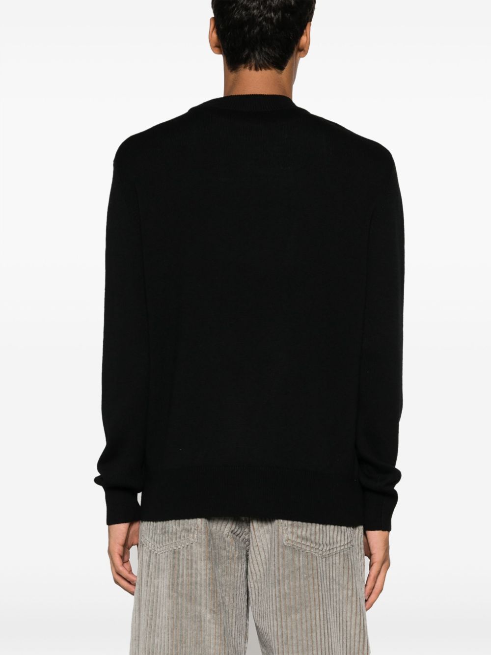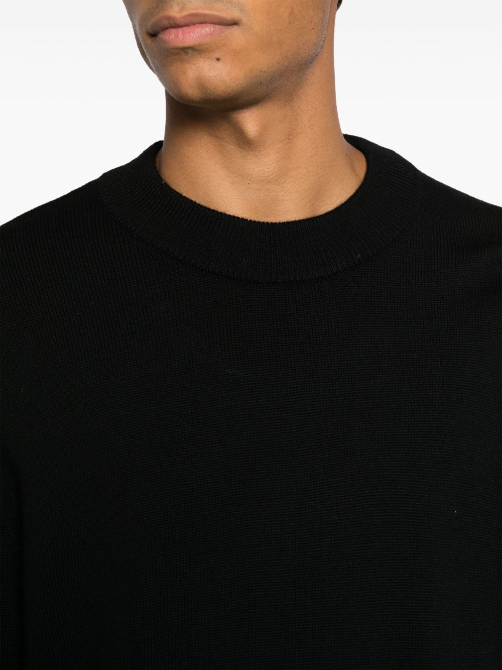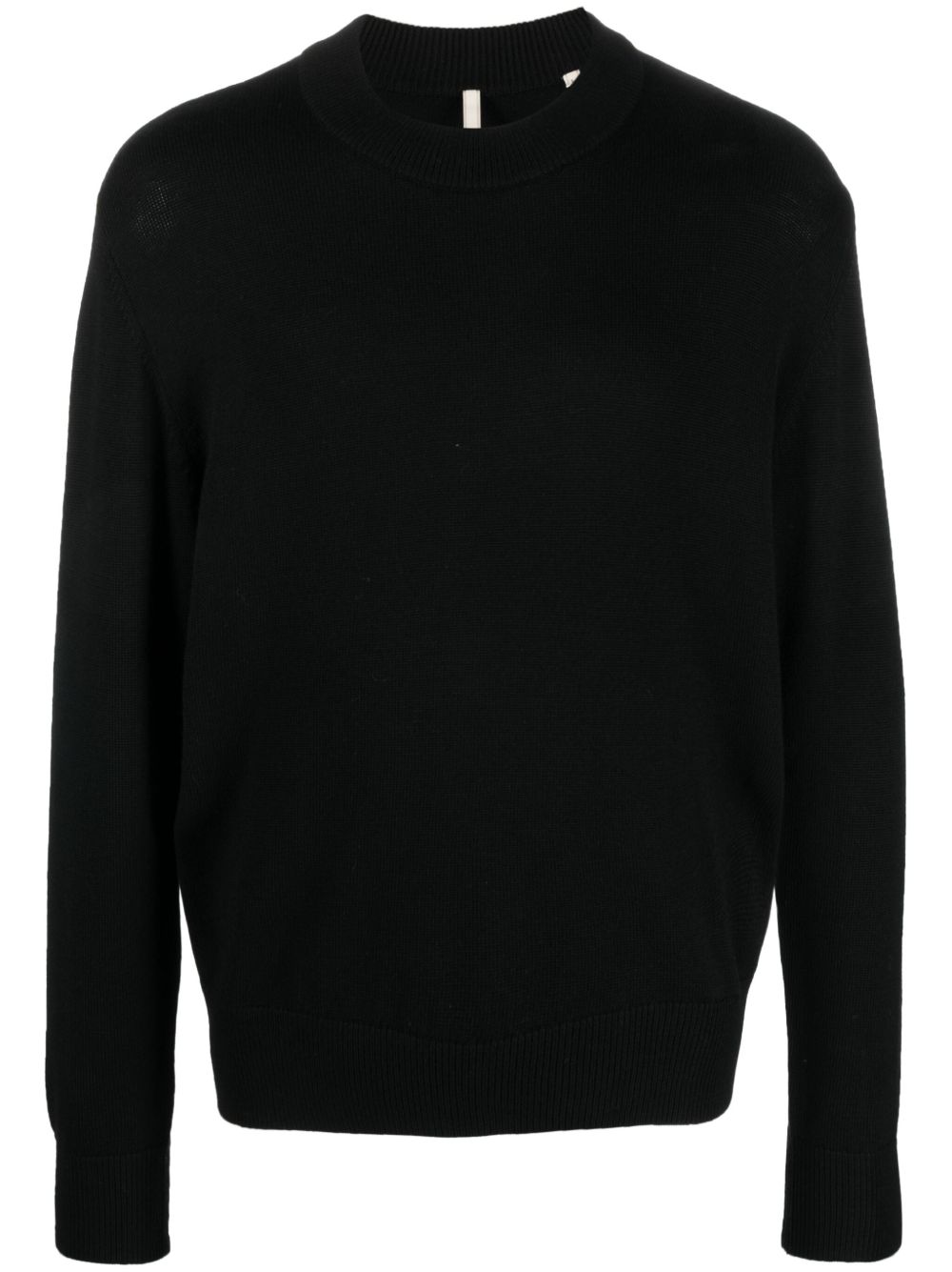 Sunflower Moon Merino black wool sweater with crew neck, relaxed shoulders, and fitted hem and cuffs.