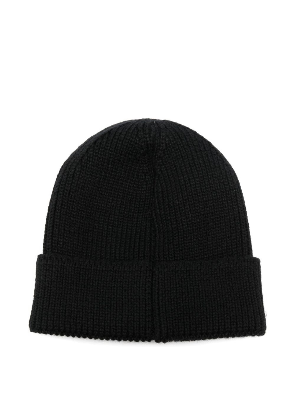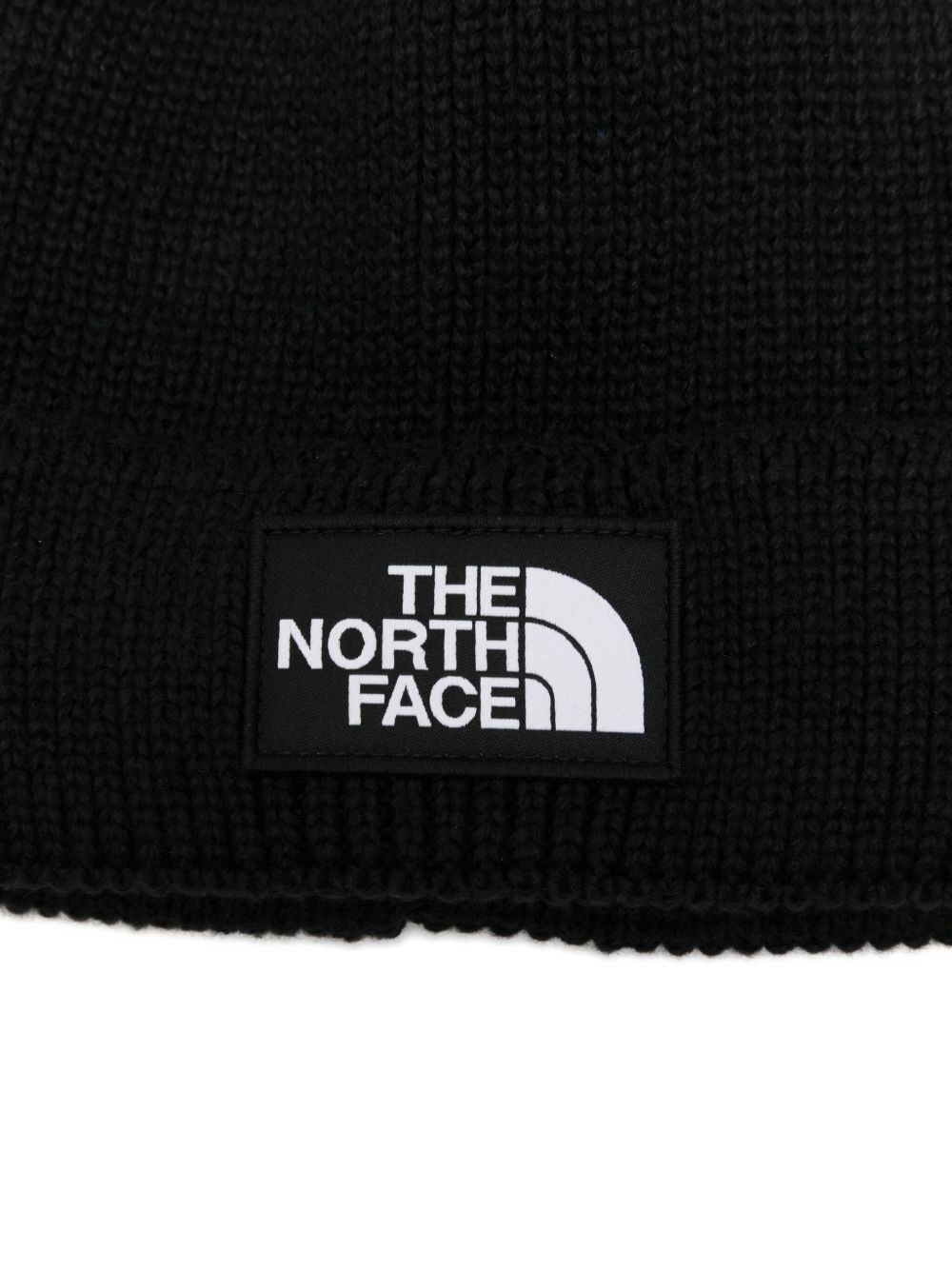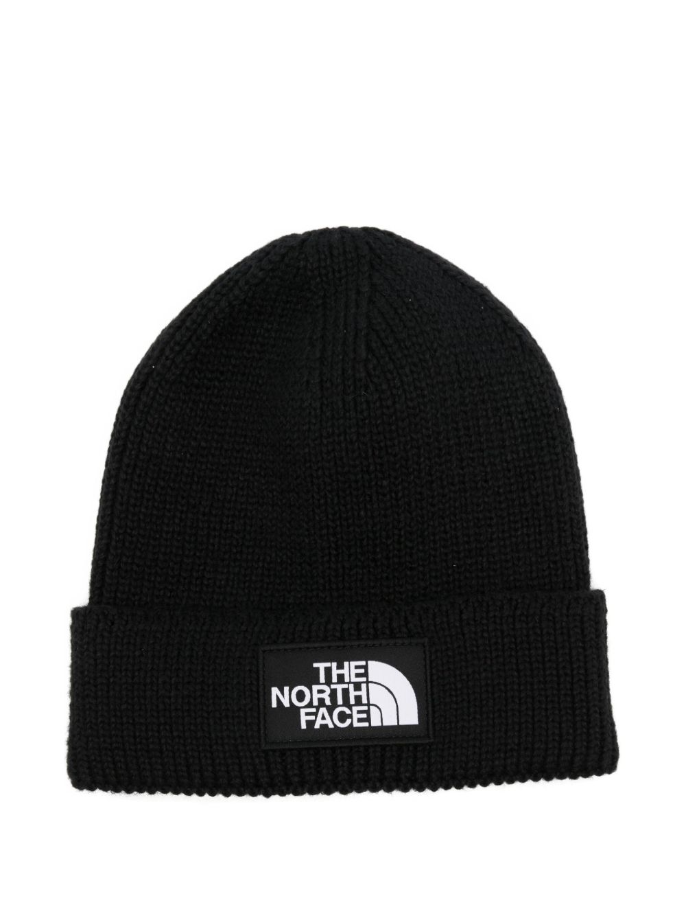 Black beanie hat by The North Face in ribbed polyester with logo and turned-up brim.