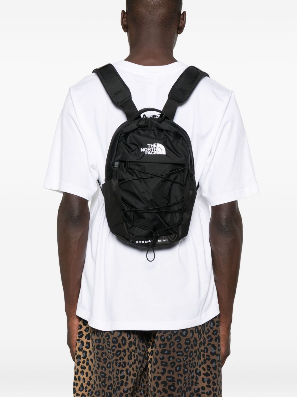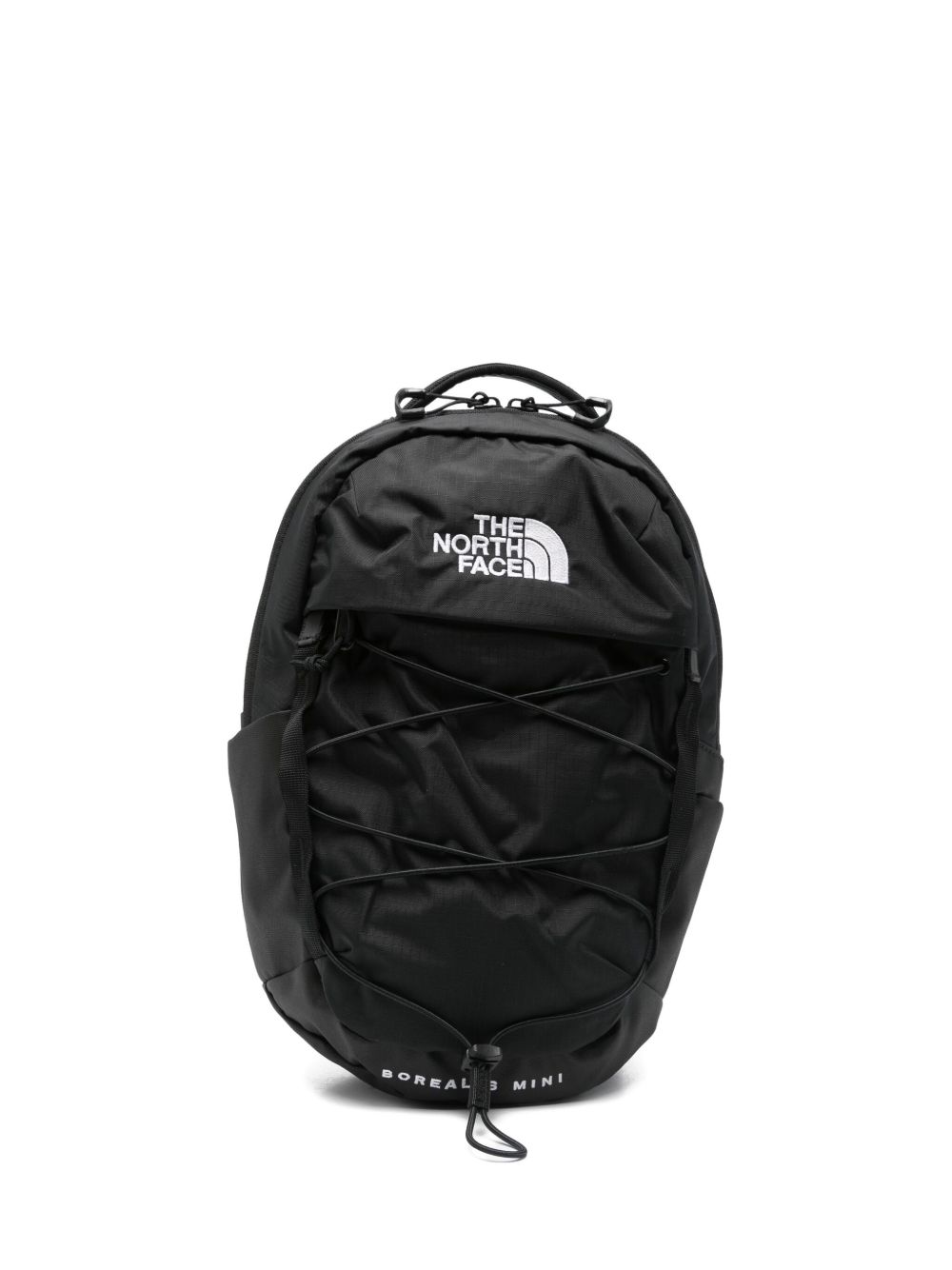 Black Borealis Mini backpack by The North Face with of the external elastic drawstring system, 10-liter volume, and two external water bottle pockets.
