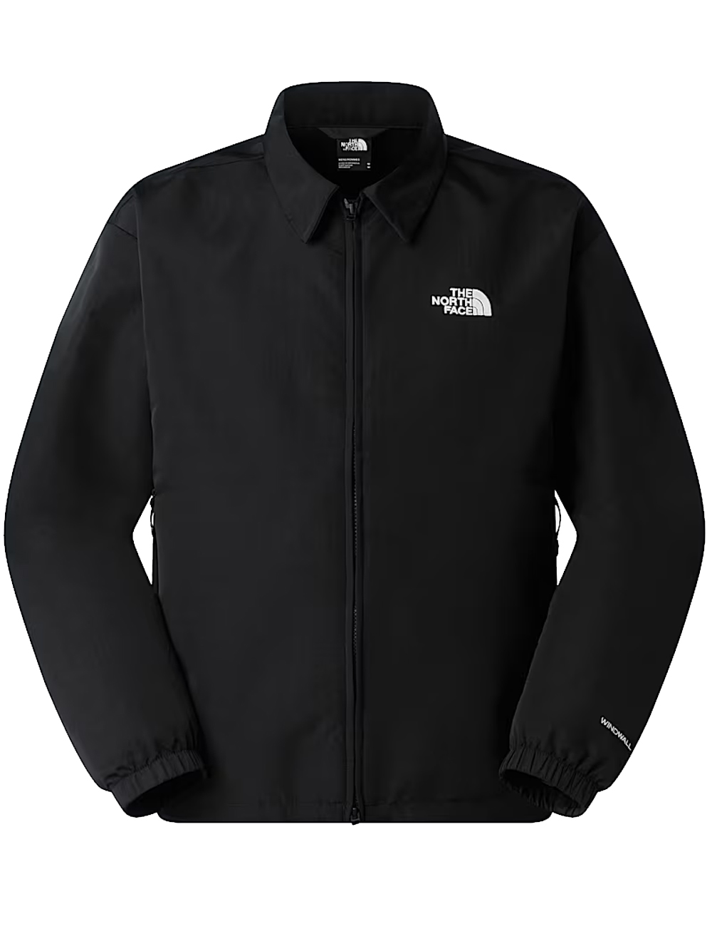 The North Face Easy Black Windbreaker in nylon, featuring a classic collar, front zip closure, zippered side pockets, embroidered logo on the chest and back, and a drawstring hem.