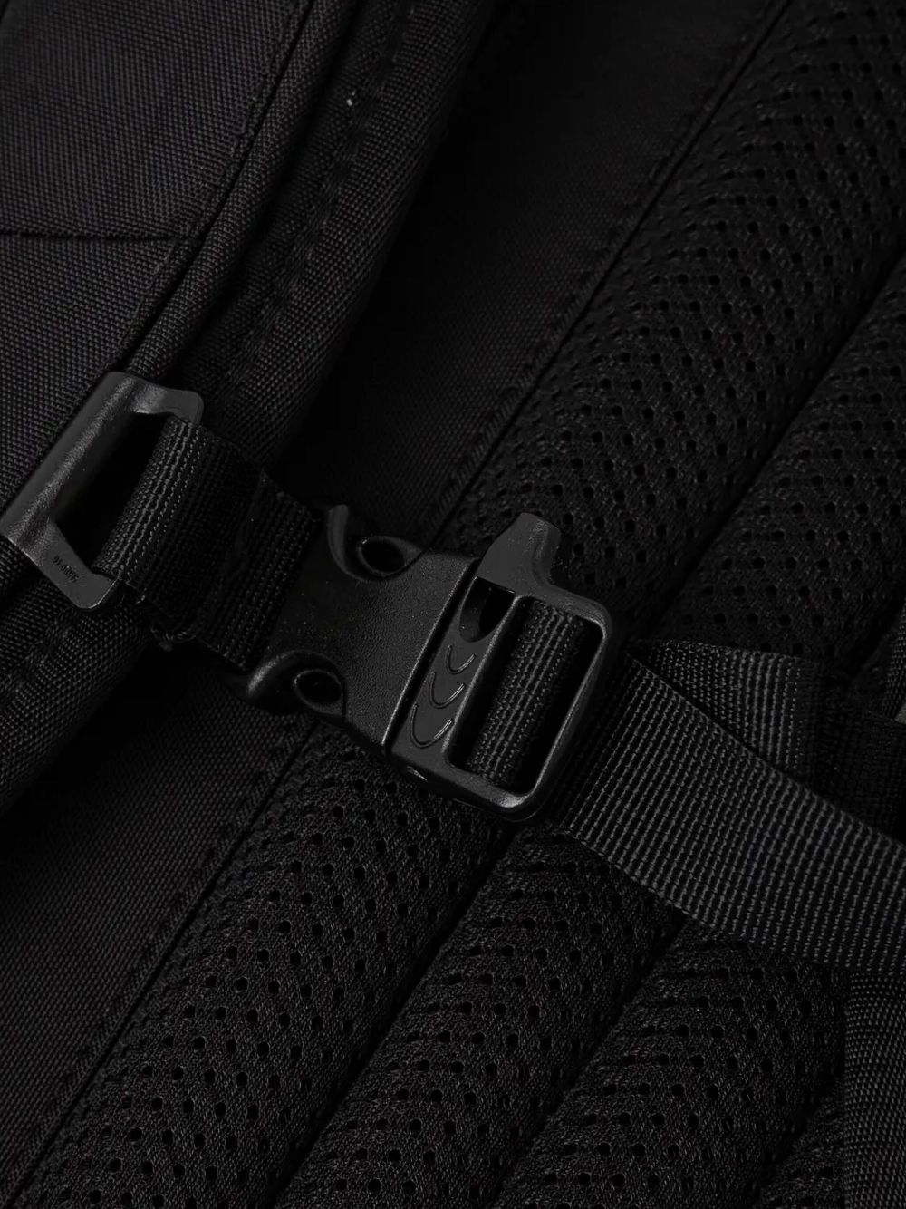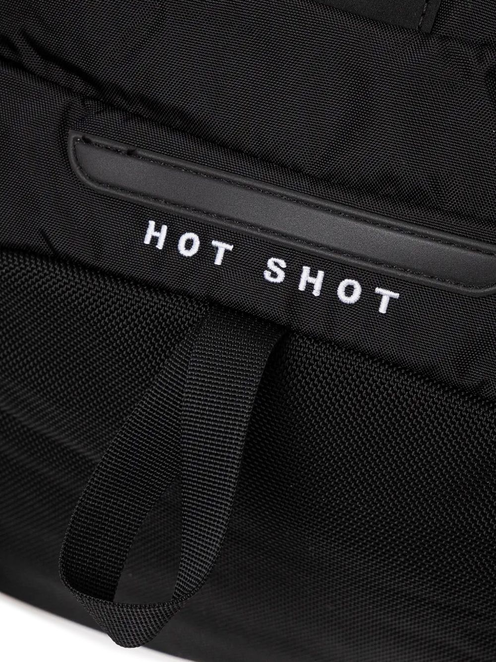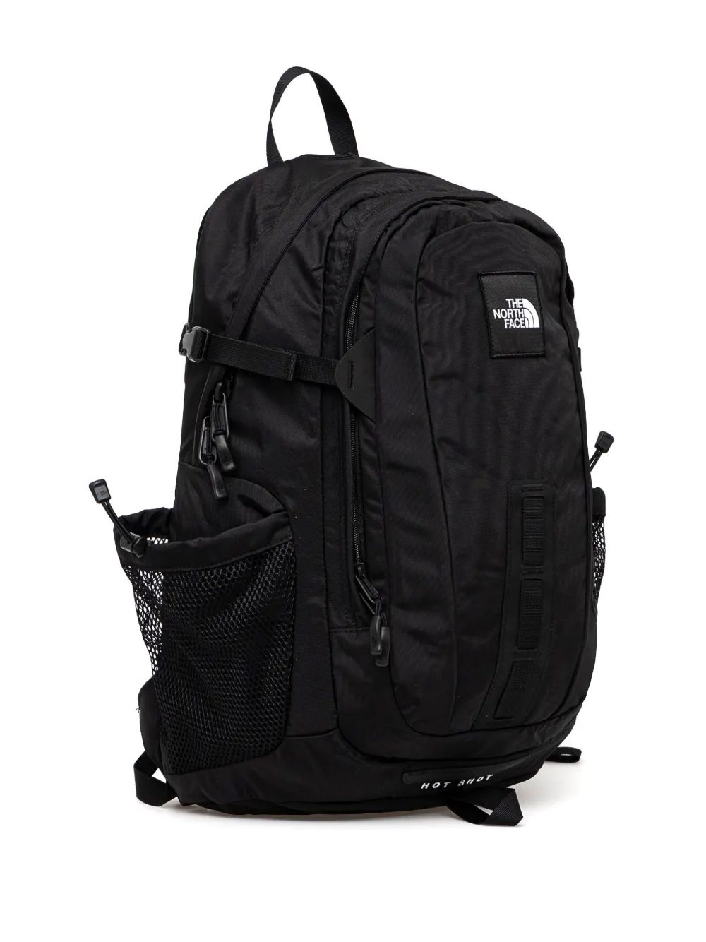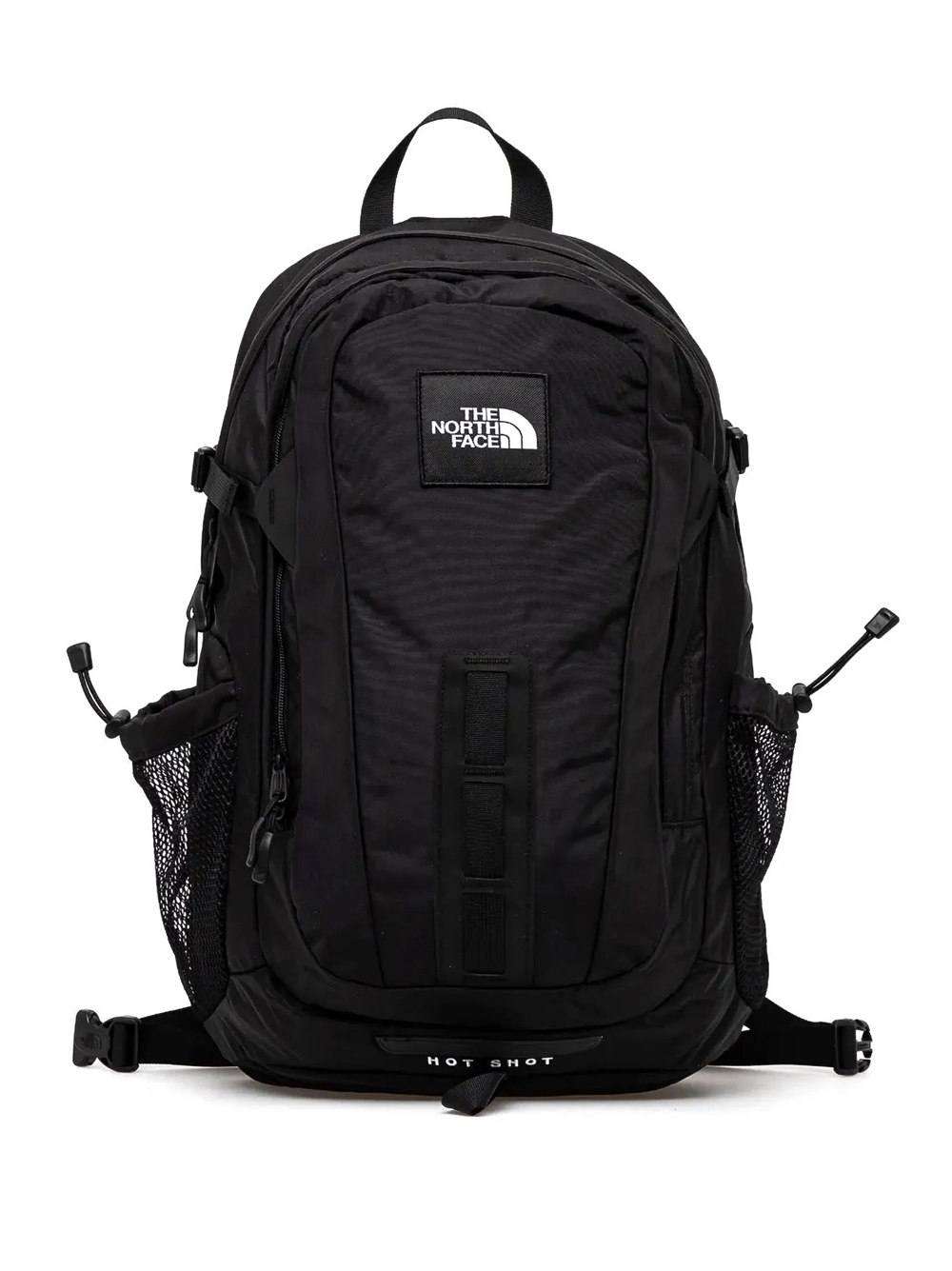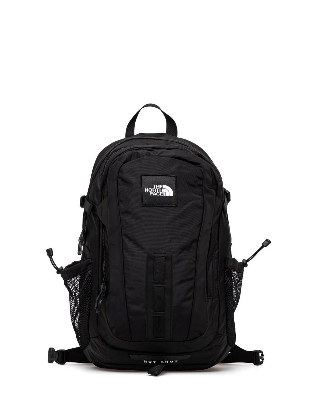 Black Hot Shot SE backpack by The North Face in polyester with handle on top, adjustable shoulder straps, two-way zipper closure, mesh pockets on sides and logo tag