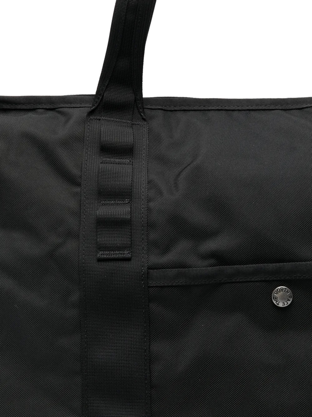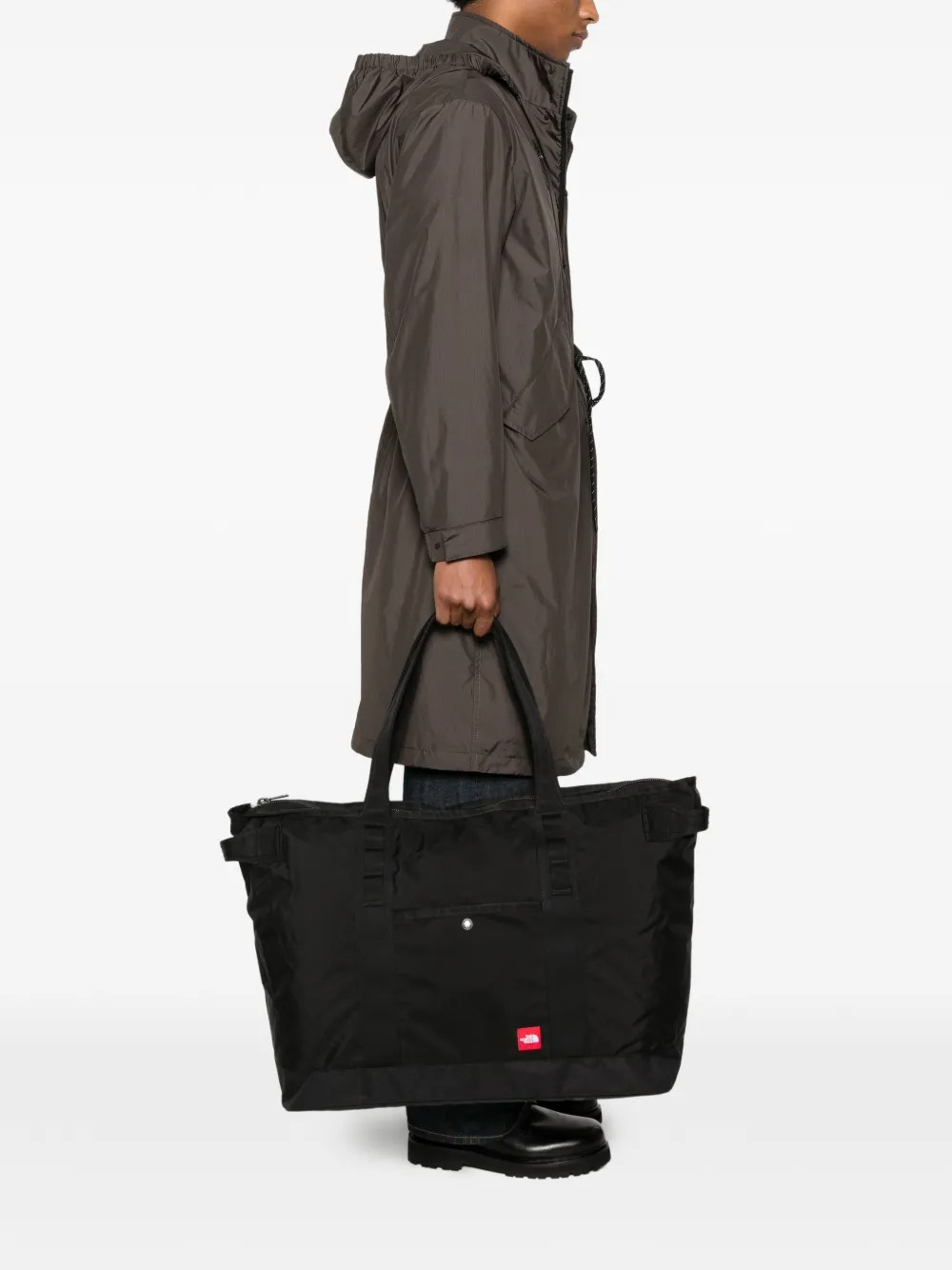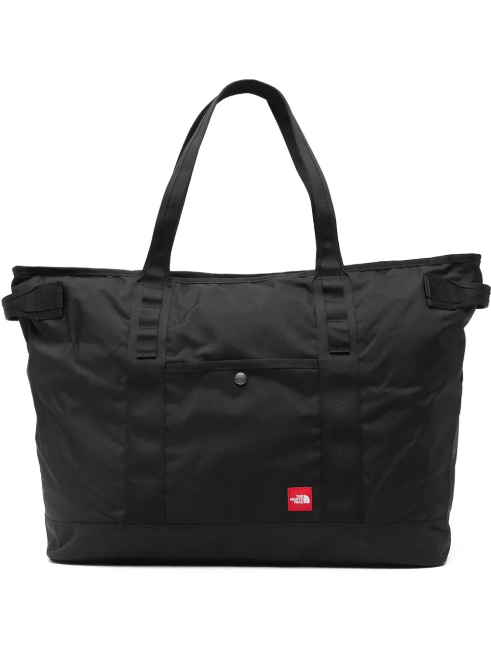 The North Face Red-Box L black nylon bag with handles, a front logo patch, a zipper closure, an internal zippered pocket, and a snap-button pocket.