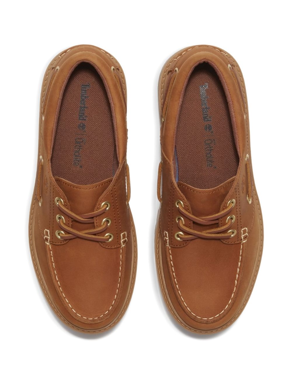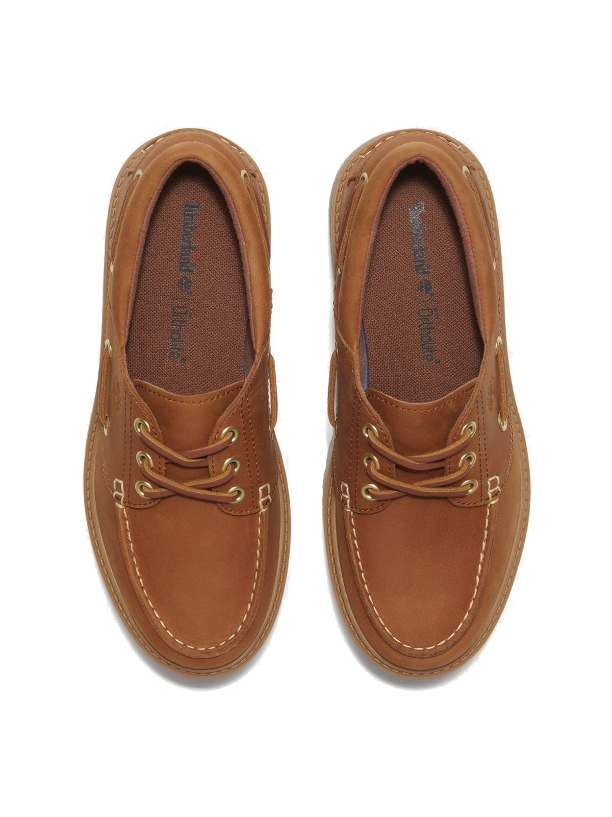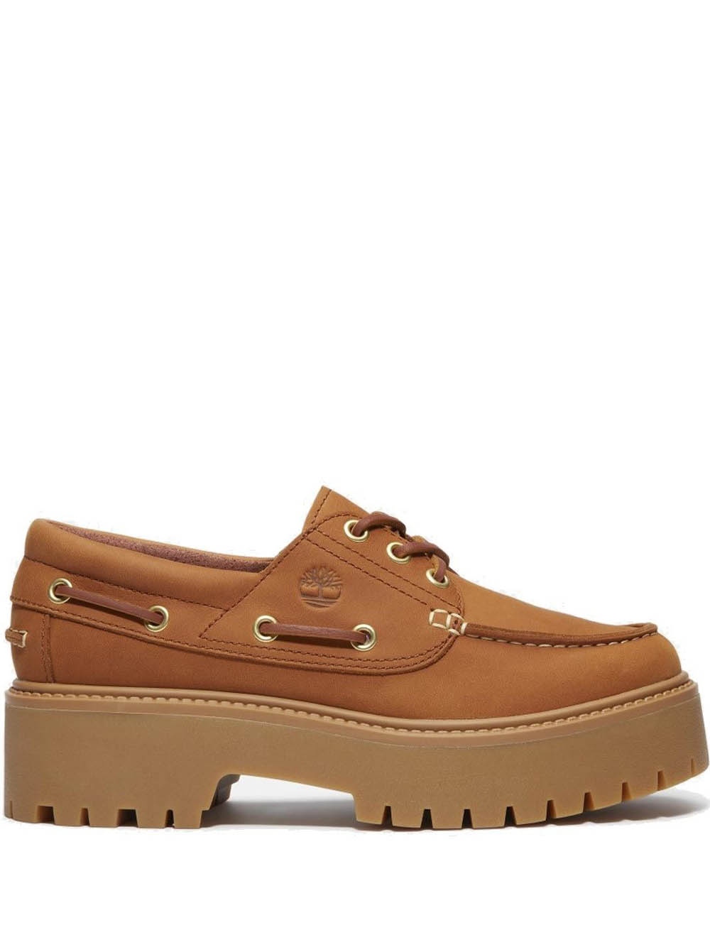 Stone Street Boat Rootbeer lace-up shoes by Timberland in leather with embossed logo on the side, round toe, front lace-up closure, side lace-up closure, logo insole, and rubber sole.