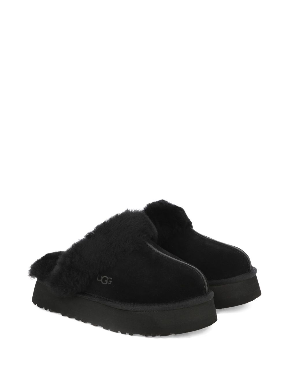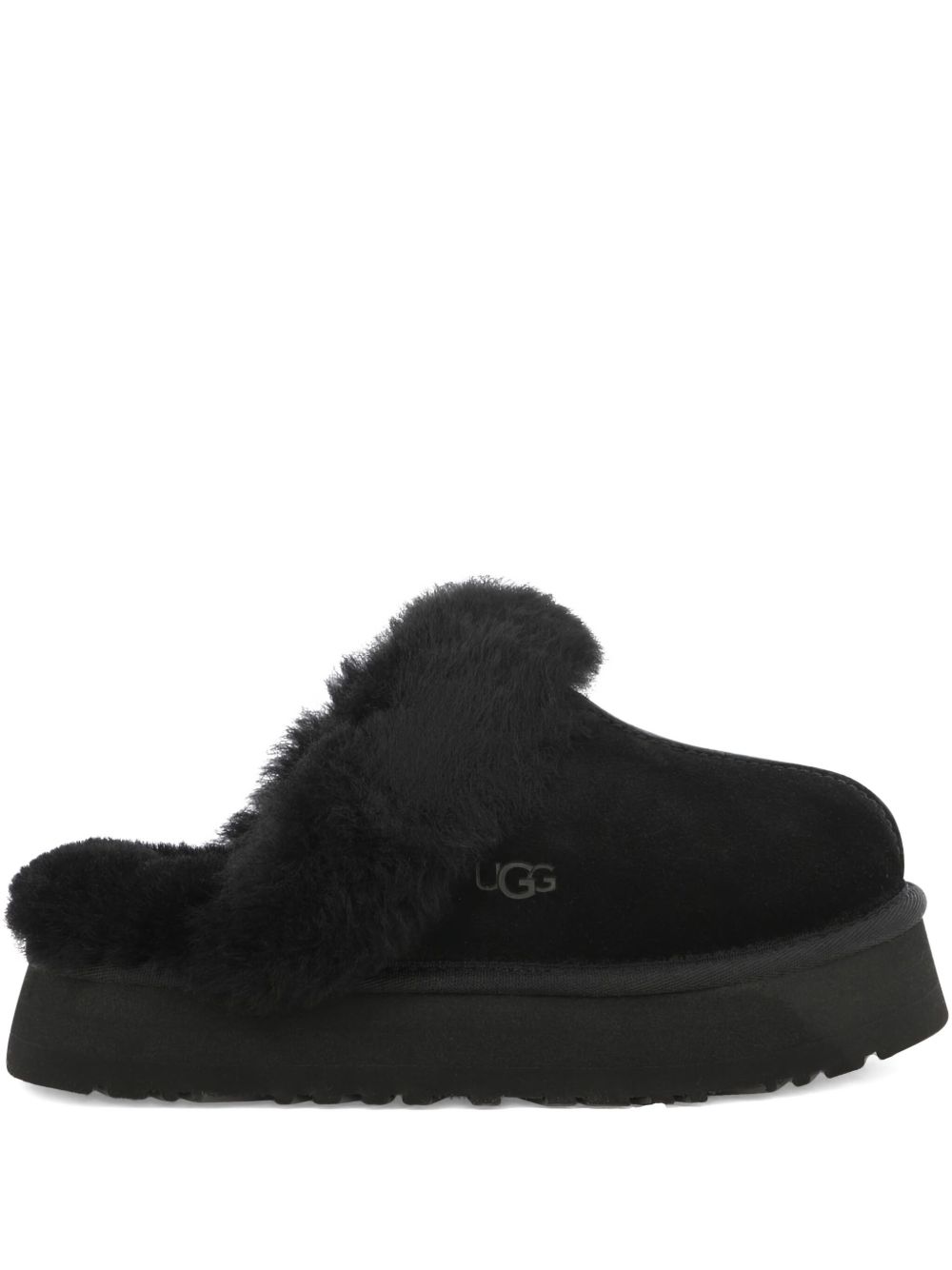 Black Disquette slippers by Ugg in suede with black fur detail, embossed logo and flat rubber sole.