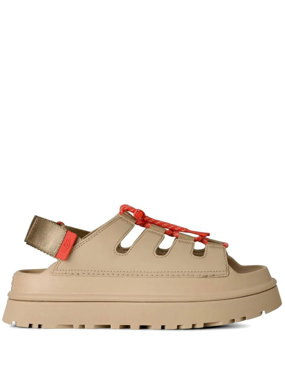 UGG Goldenglow Toggle Sandals in rubber with cut-out detailing, lace-up closure, logo appliqué, platform, and grooved sole.