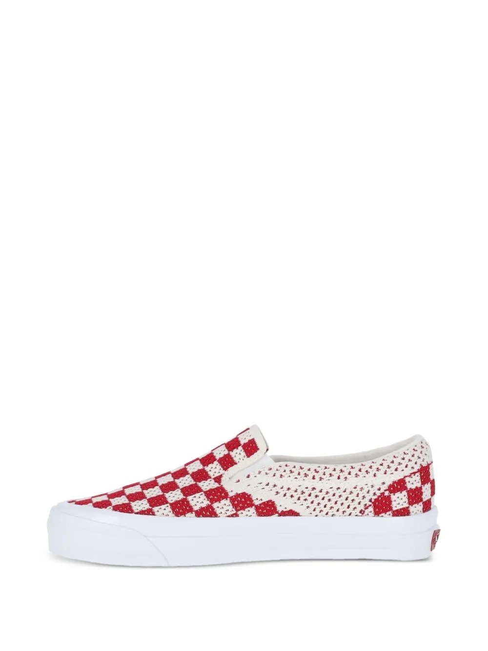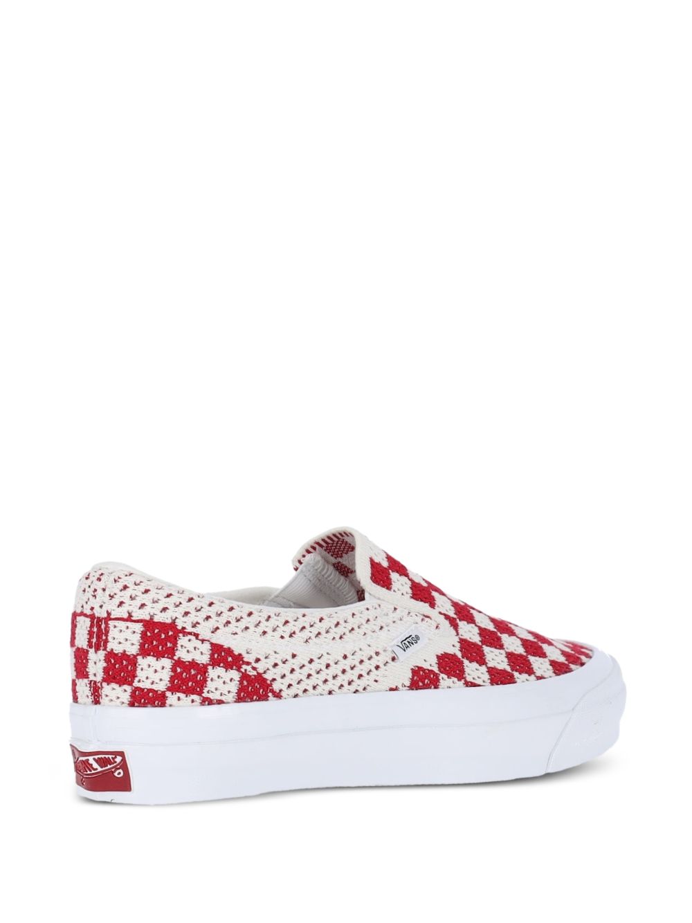 Vans Classic Slip-On 98 red and white sneakers made of fabric, featuring a slip-on design, logo patches on the side, a logo print on the back, a branded insole, a rounded toe, and a rubber sole.