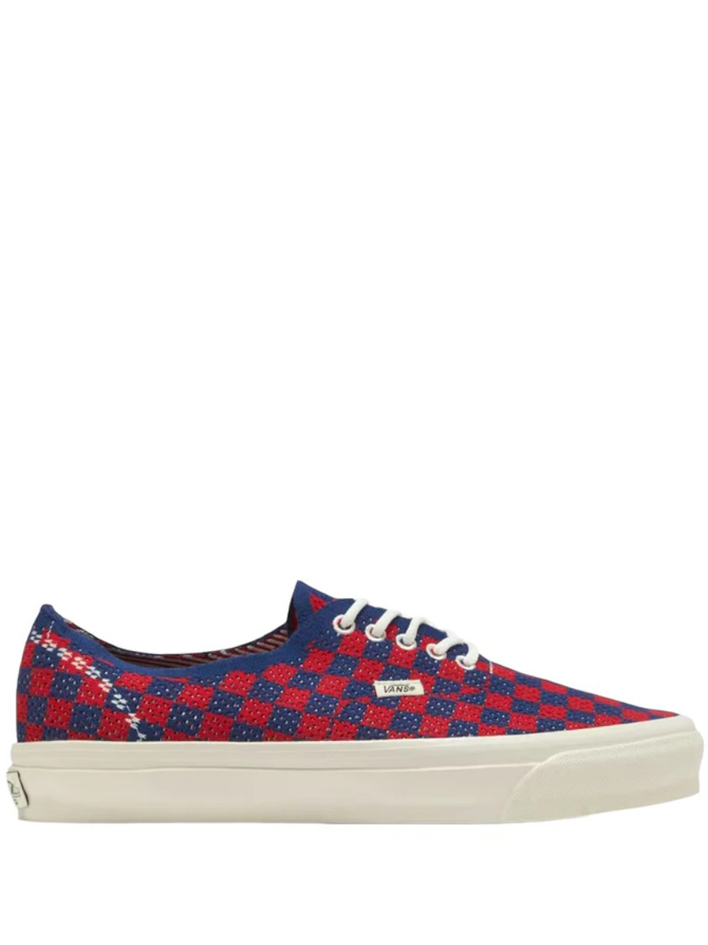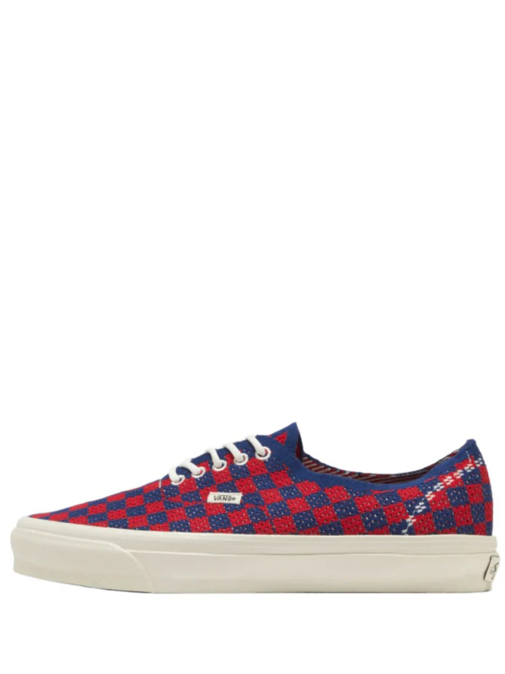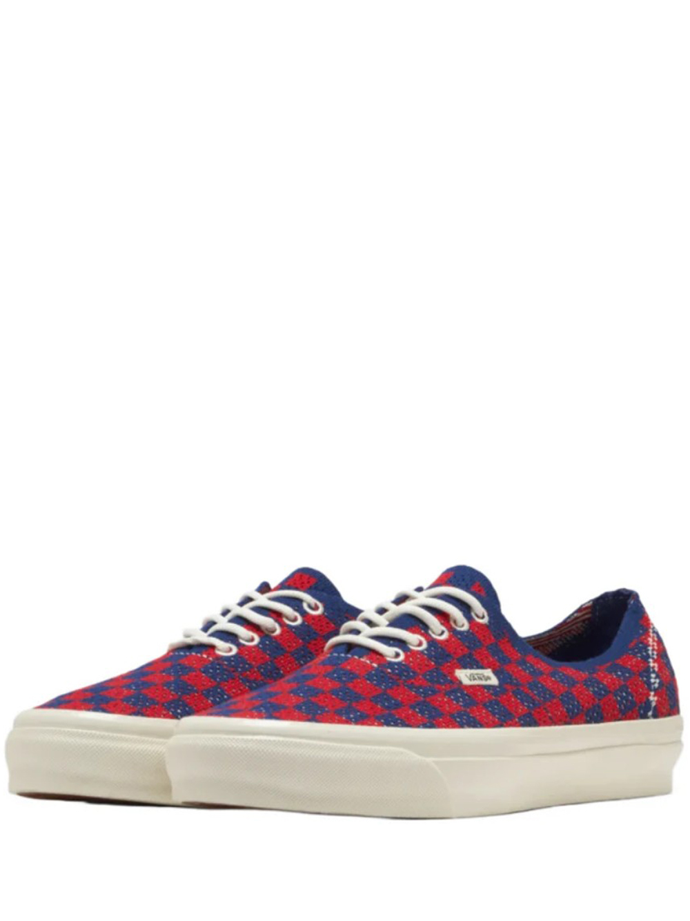 Vans Lx Authentic 44 red and navy cotton sneakers with a lace-up front, logo patches on the side, a logo print on the back, a branded insole, a rounded toe, and a rubber sole.