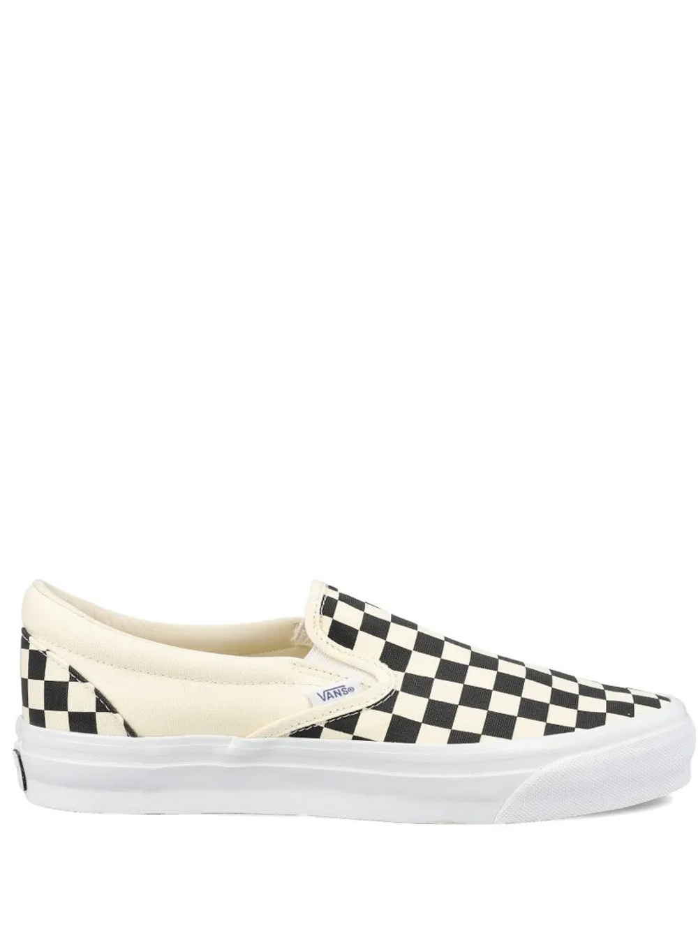 Vans Premium Slip-On 98 black cotton sneakers featuring a slip-on design, logo patches on the side, a logo print on the back, a branded insole, a rounded toe, and a rubber sole.
