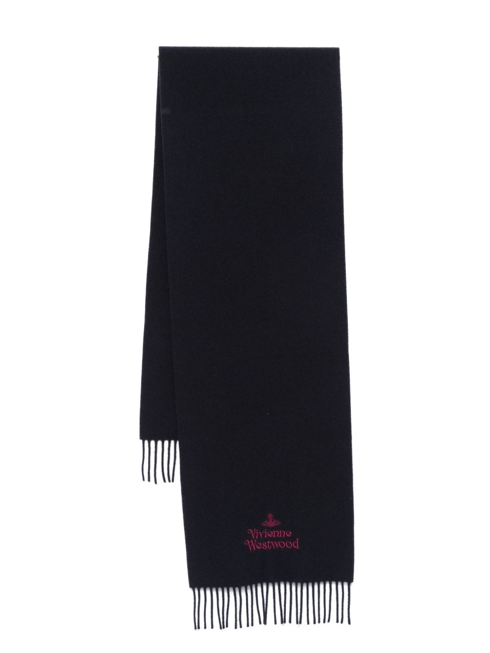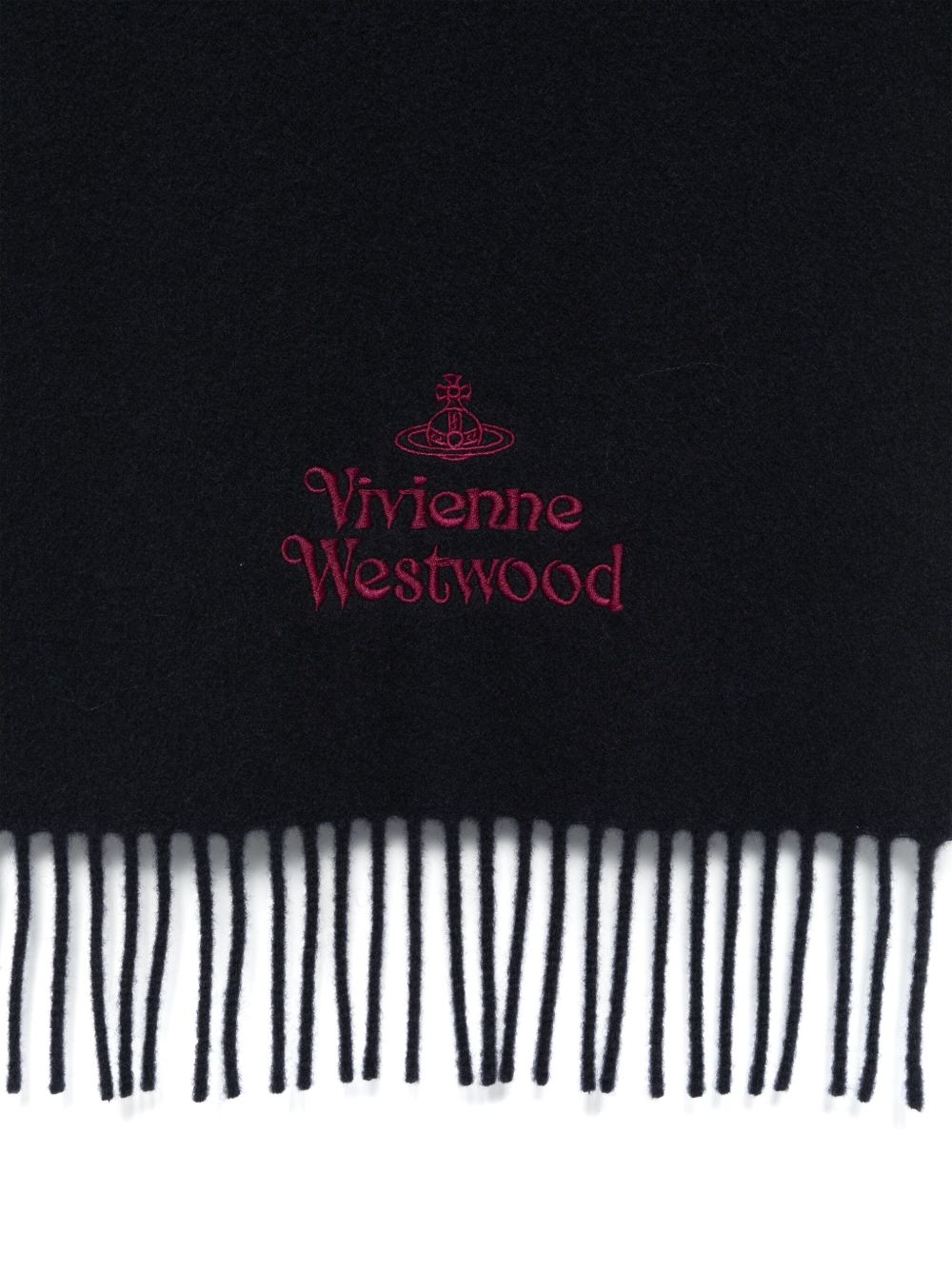 Embroidered scarf in soft wool featuring the Maison's signature, fringed edges, and an embroidered Orb.