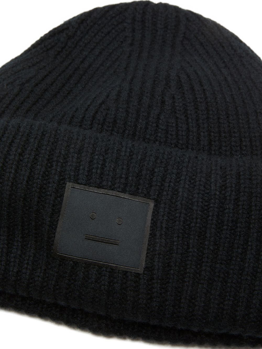 Beanie nero Large Face Logo di Acne Studios in lana con applicazione con ricamo frontale e bordo rovesciato.