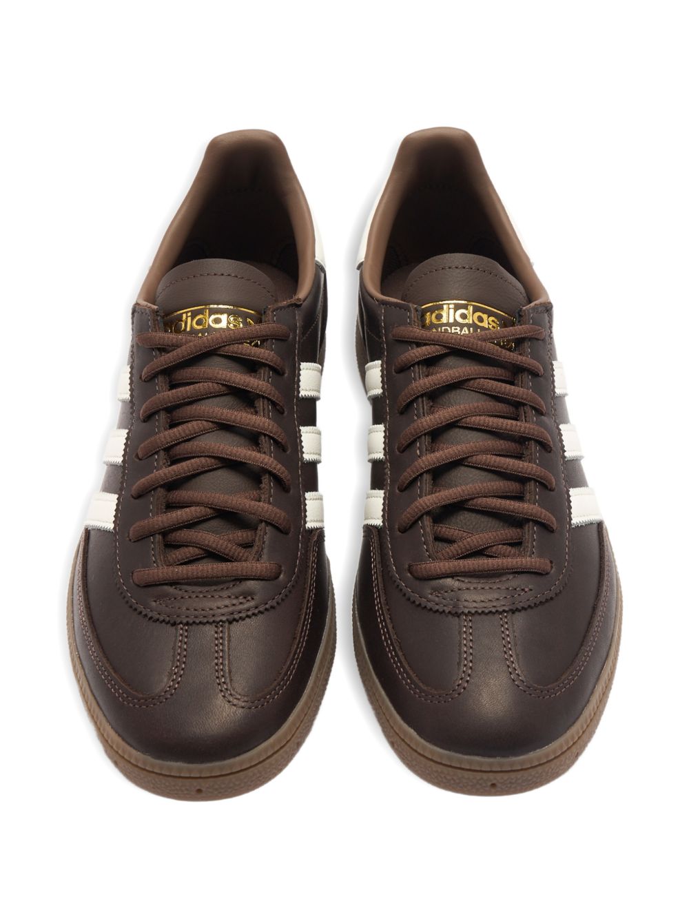 Sneakers marroni Handball Spezial di Adidas in pelle con punta tonda, chiusura con lacci sul davanti, dettaglio caratteristico 3-Stripes sui lati, etichetta posteriore con logo e linguetta con logo.