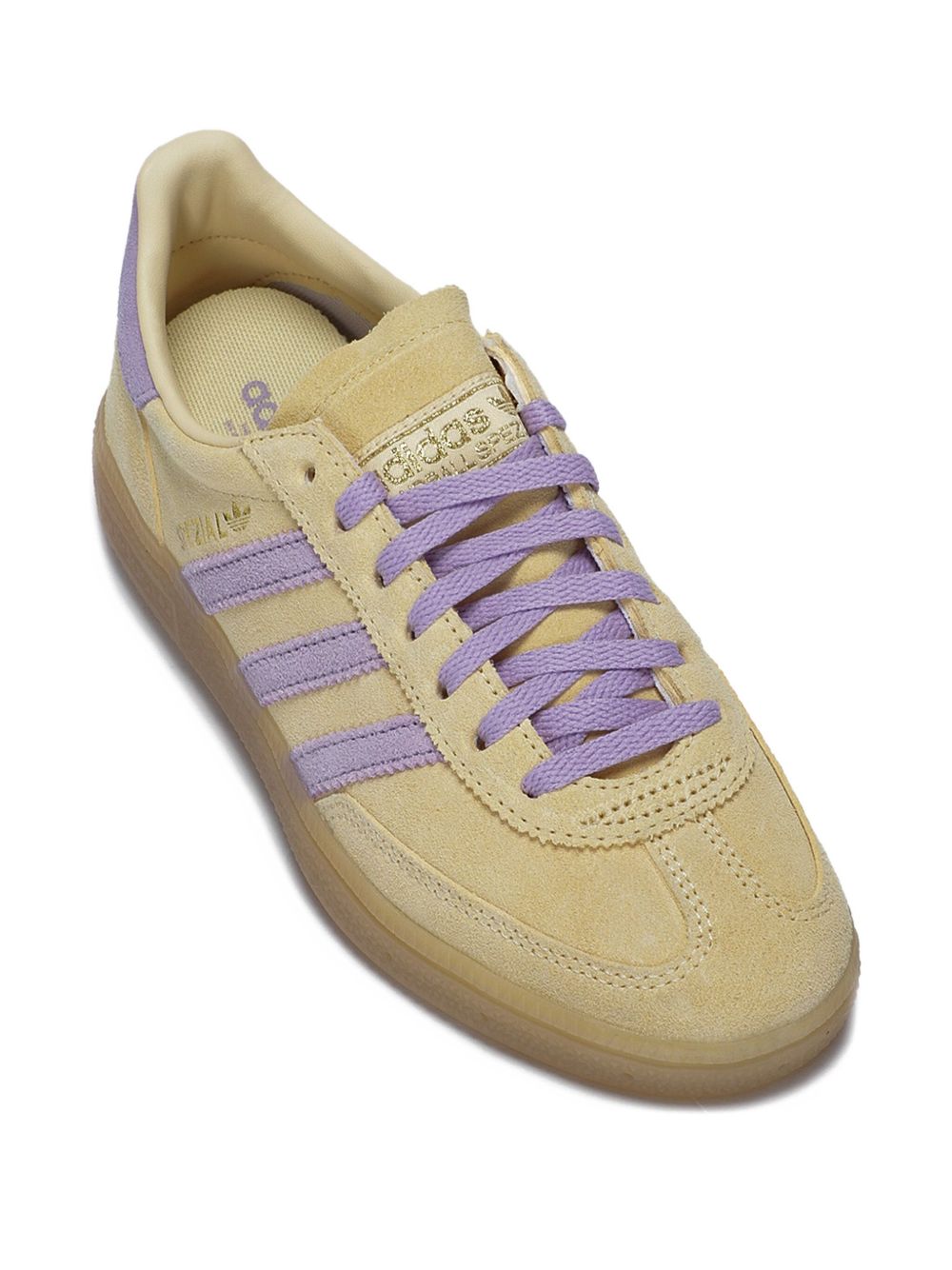 Sneakers giallo chiaro Handball Spezial W di Adidas in pelle con punta tonda, chiusura con lacci sul davanti, dettaglio caratteristico 3-Stripes sui lati, etichetta posteriore con logo e linguetta con logo.