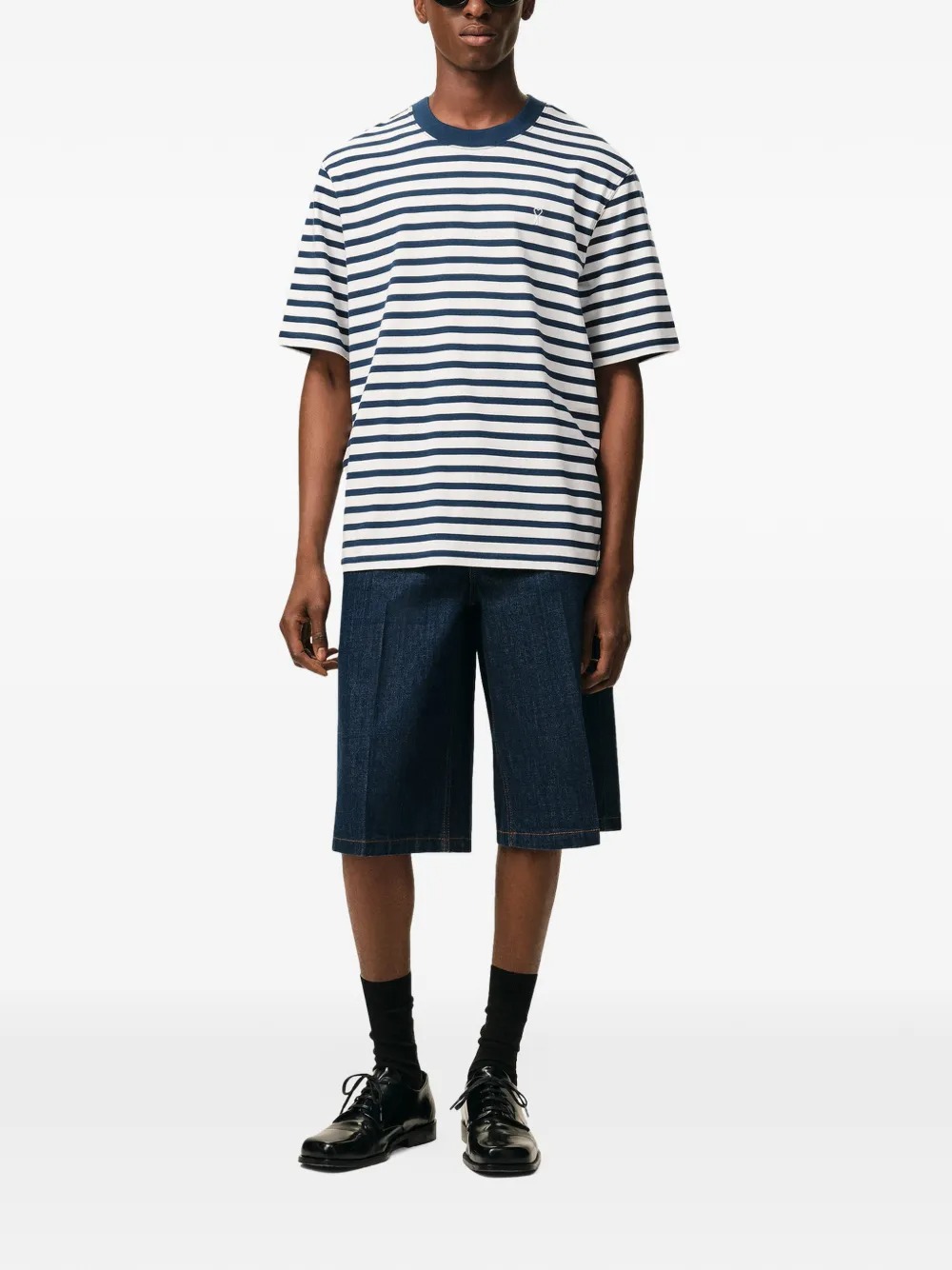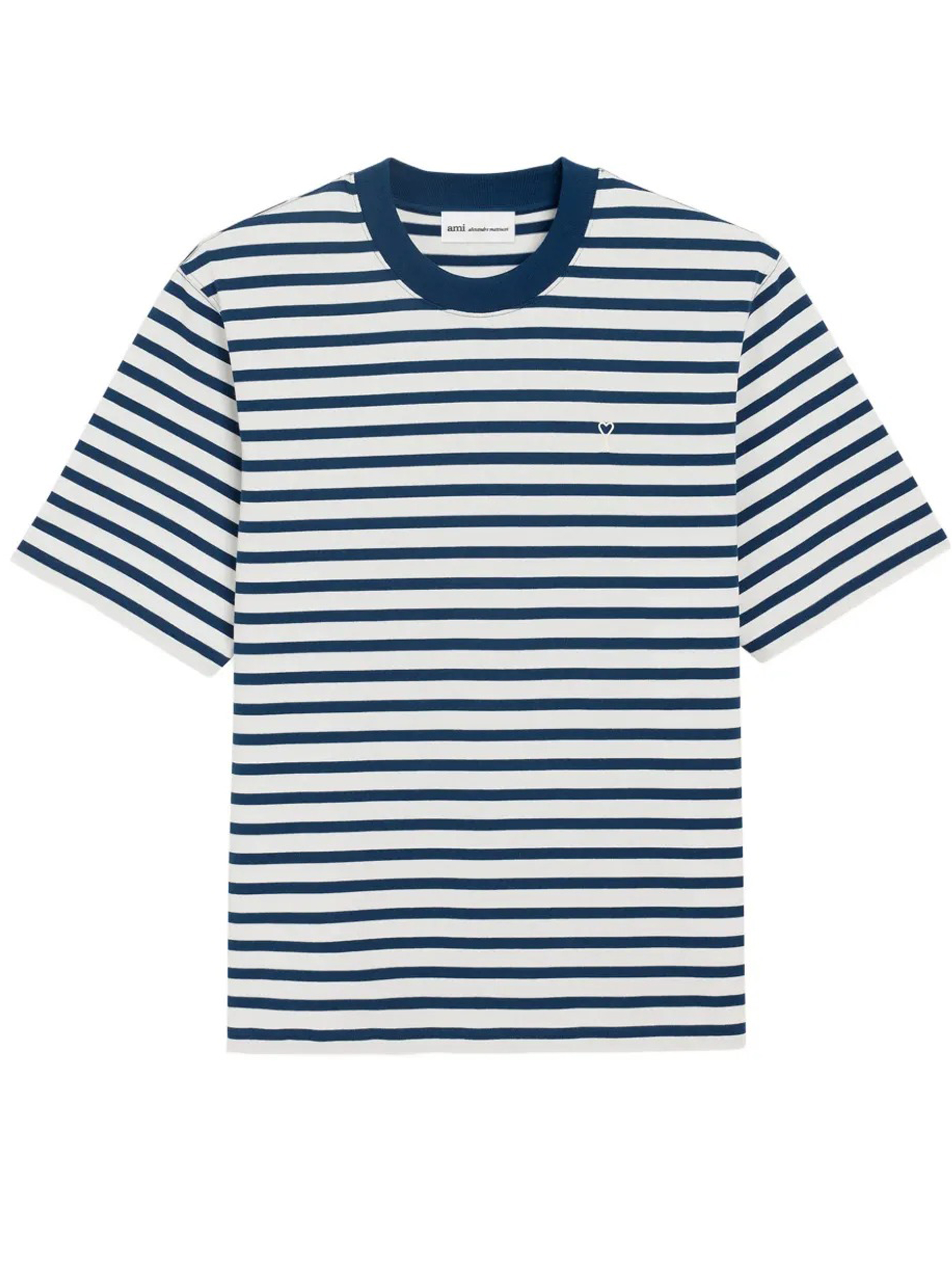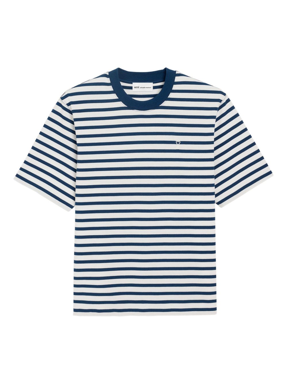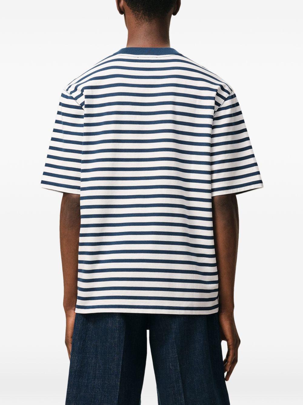 T-shirt blu e bianca Mariniere sdi Ami Paris in cotone con girocollo e orlo dritto.