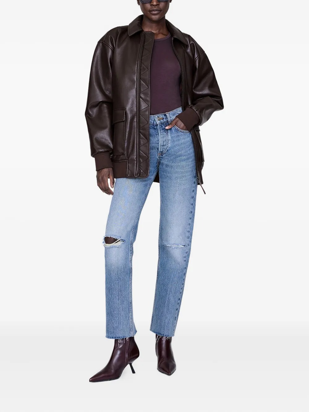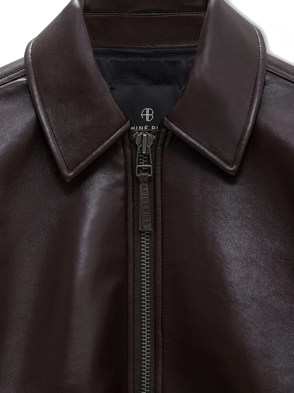 Giacca marrone scuro Kelanie di Anine Bing in pelle con colletto classico, chiusura frobtale con zip, tasche frontali, orlo e polsini elasticizzati.