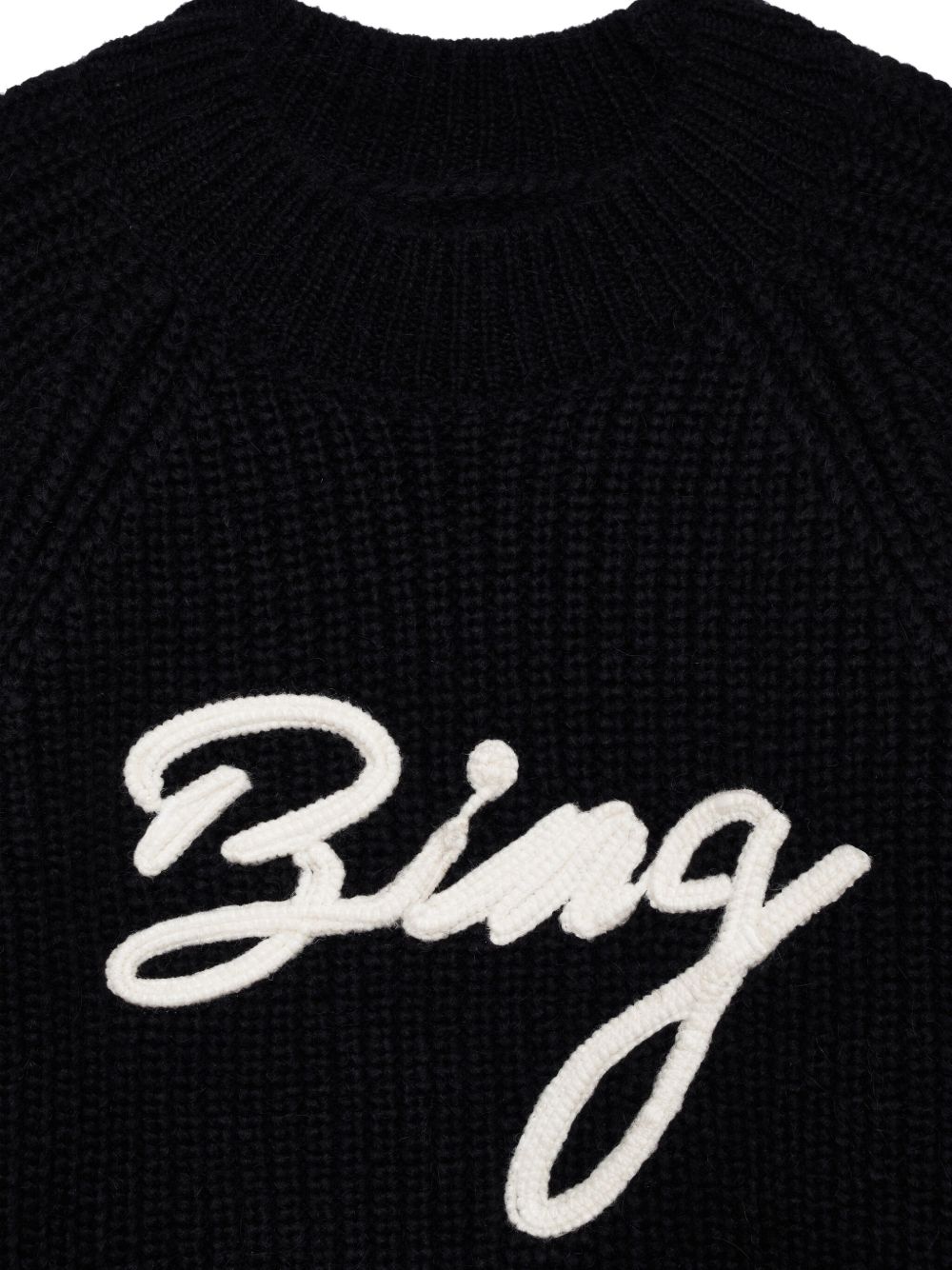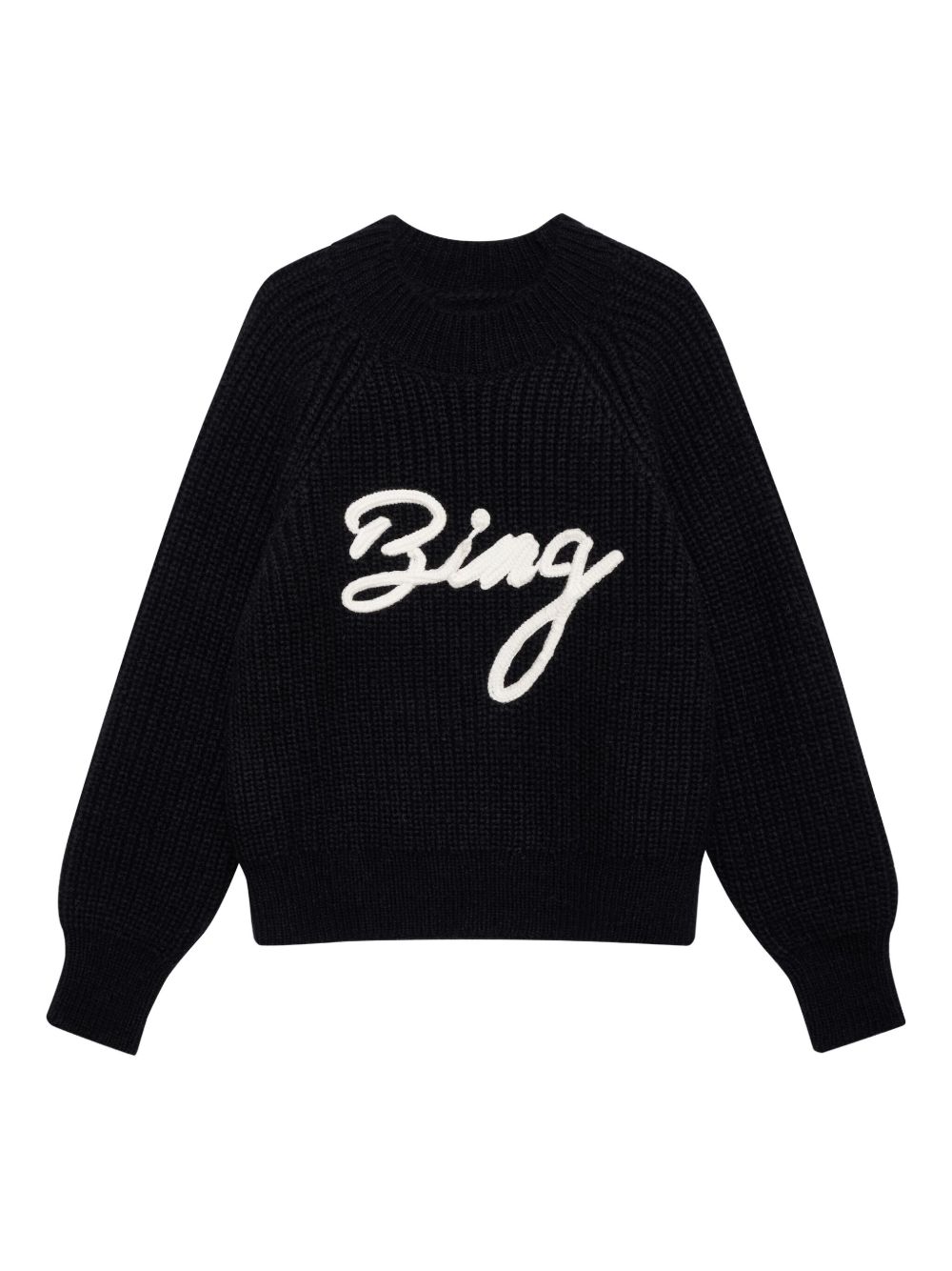 Maglione nero Kendrick di Anine Bing in misto lana e alpaca con gricollo, manica lunga, trama lavorata a maglia, ricamo frontale, orlo e polsini a coste.