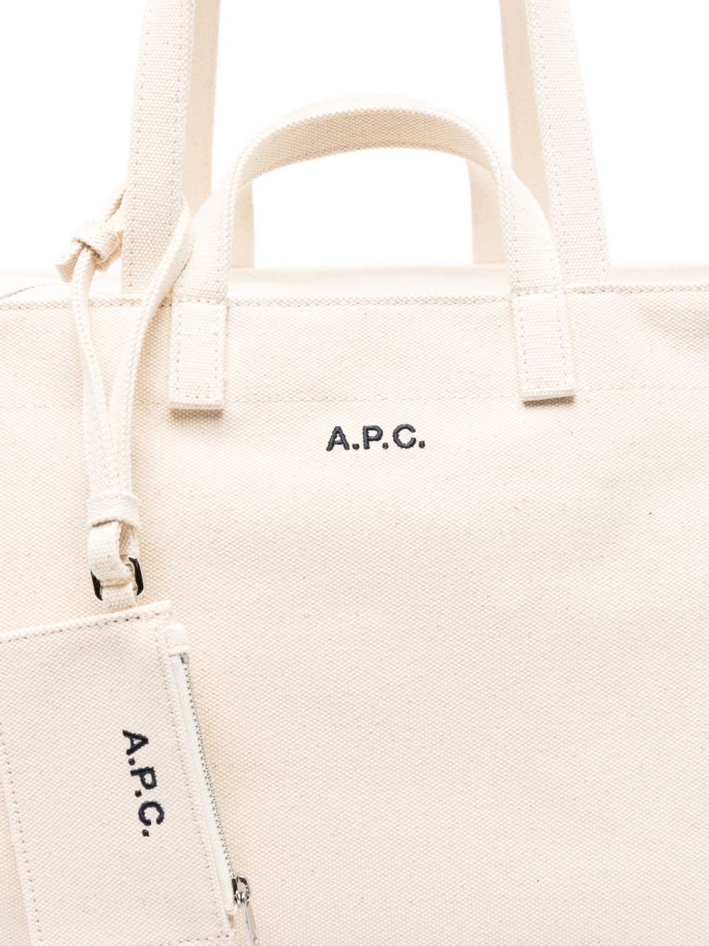 Borsa ecru di APC in cotone con dippio manico, chiusura superiore con zip e tasca interna.