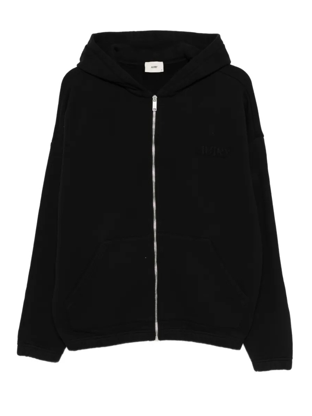 Autry gray cotton sweatshirt with drawstring hood, front zip closure, long sleeves, and ribbed hem and cuffs.