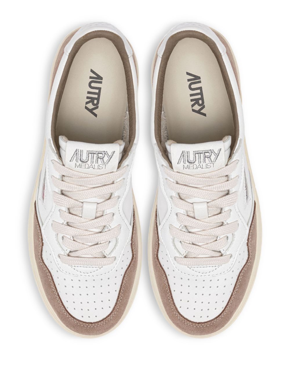 Sneakers bianche e marrone Medalist Low Aulm ft02 di Autry in pelle con punta tonda, design traforato, chiusura con lacci, etichetta con logo e suola in gomma.