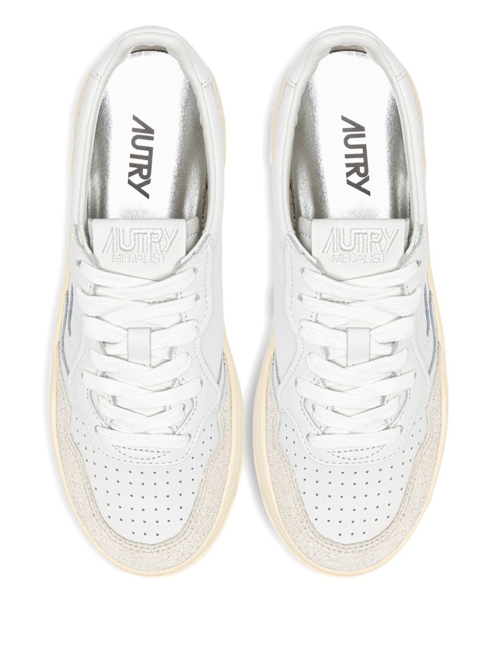 Sneakers bianche Medalist PTL WLPK01 di Autry in pelle con punta tonda, design traforato, etichetta con logo su un lato, chiusura con lacci, contrafforte a contrasto e suola alta in gomma.