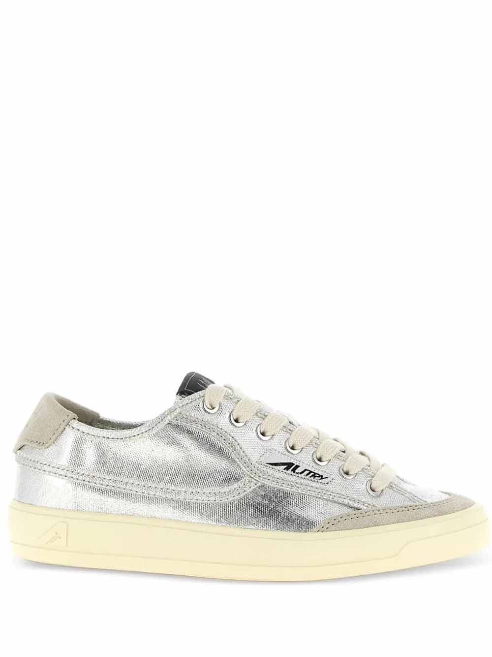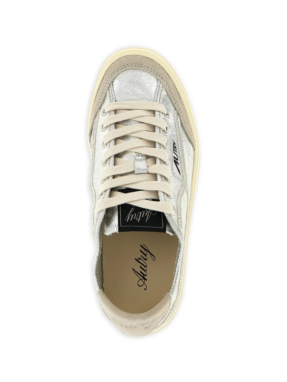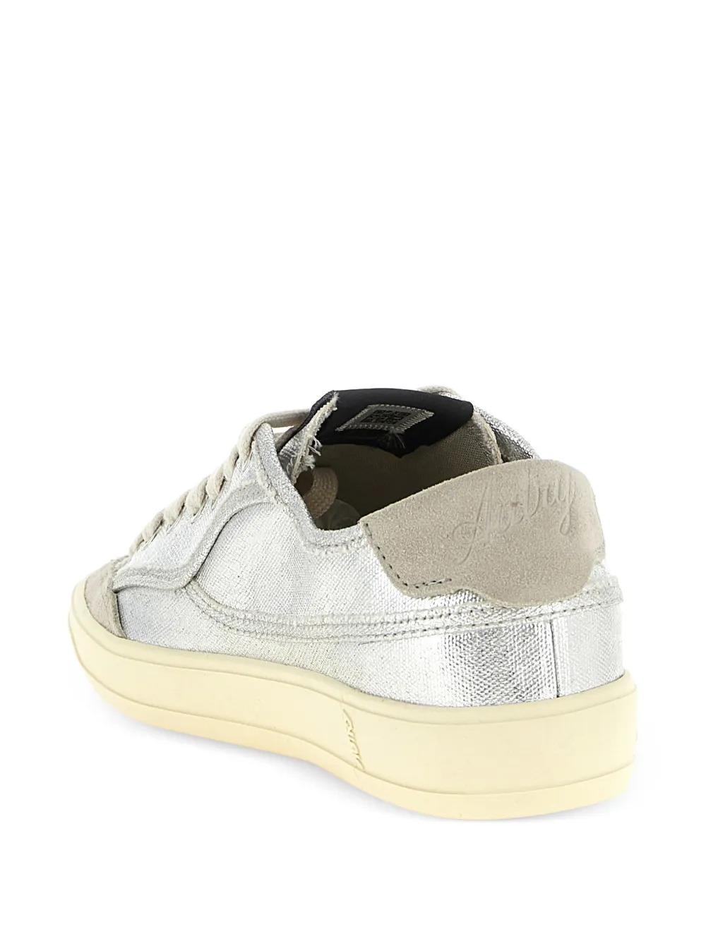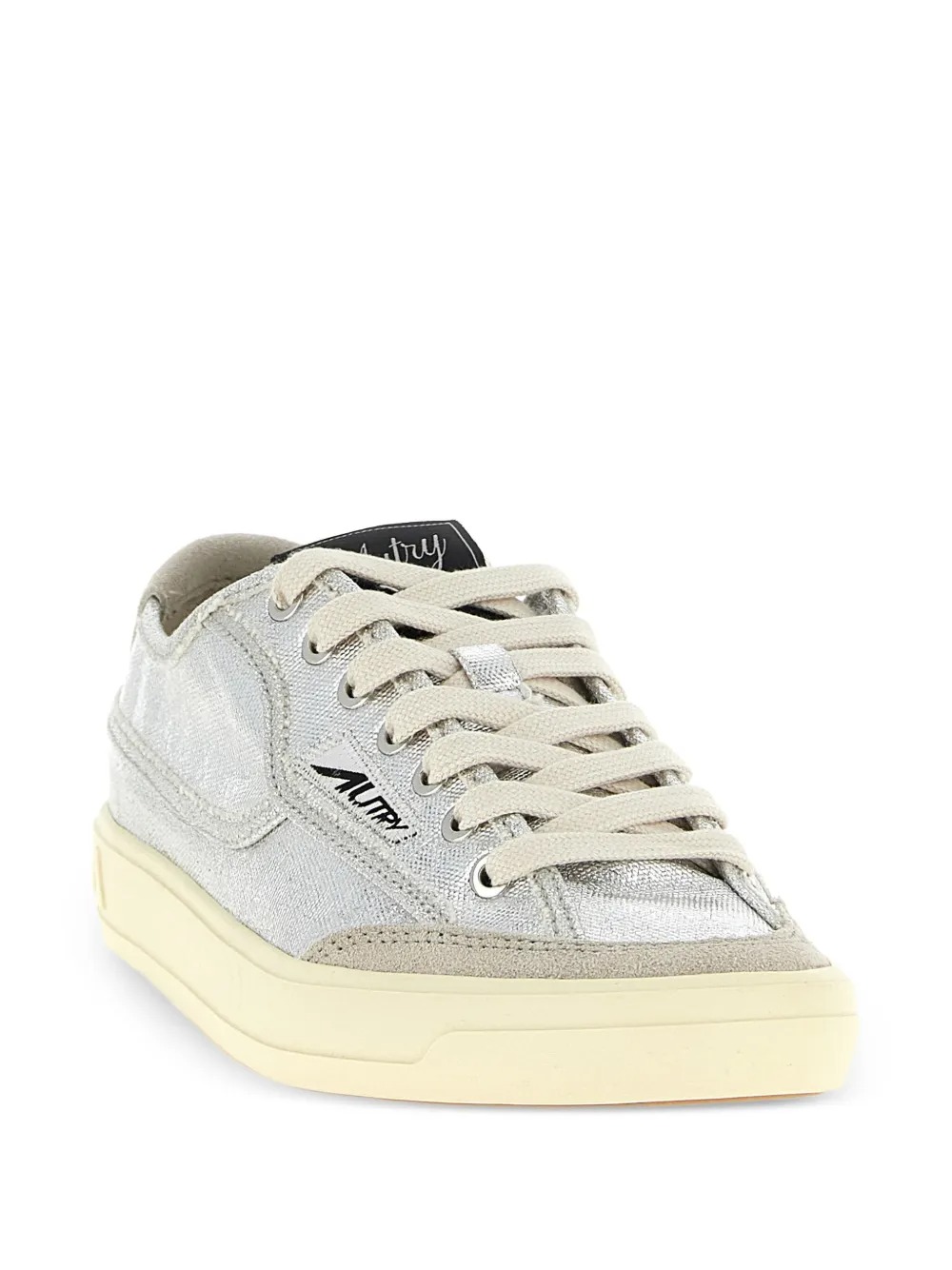 Sneakers argento Windscape di Autry in pelle e tela con linguetta sul tallone in pelle nera, inserti in pelle scamosciata, toppa con logo, punta arrotondata.