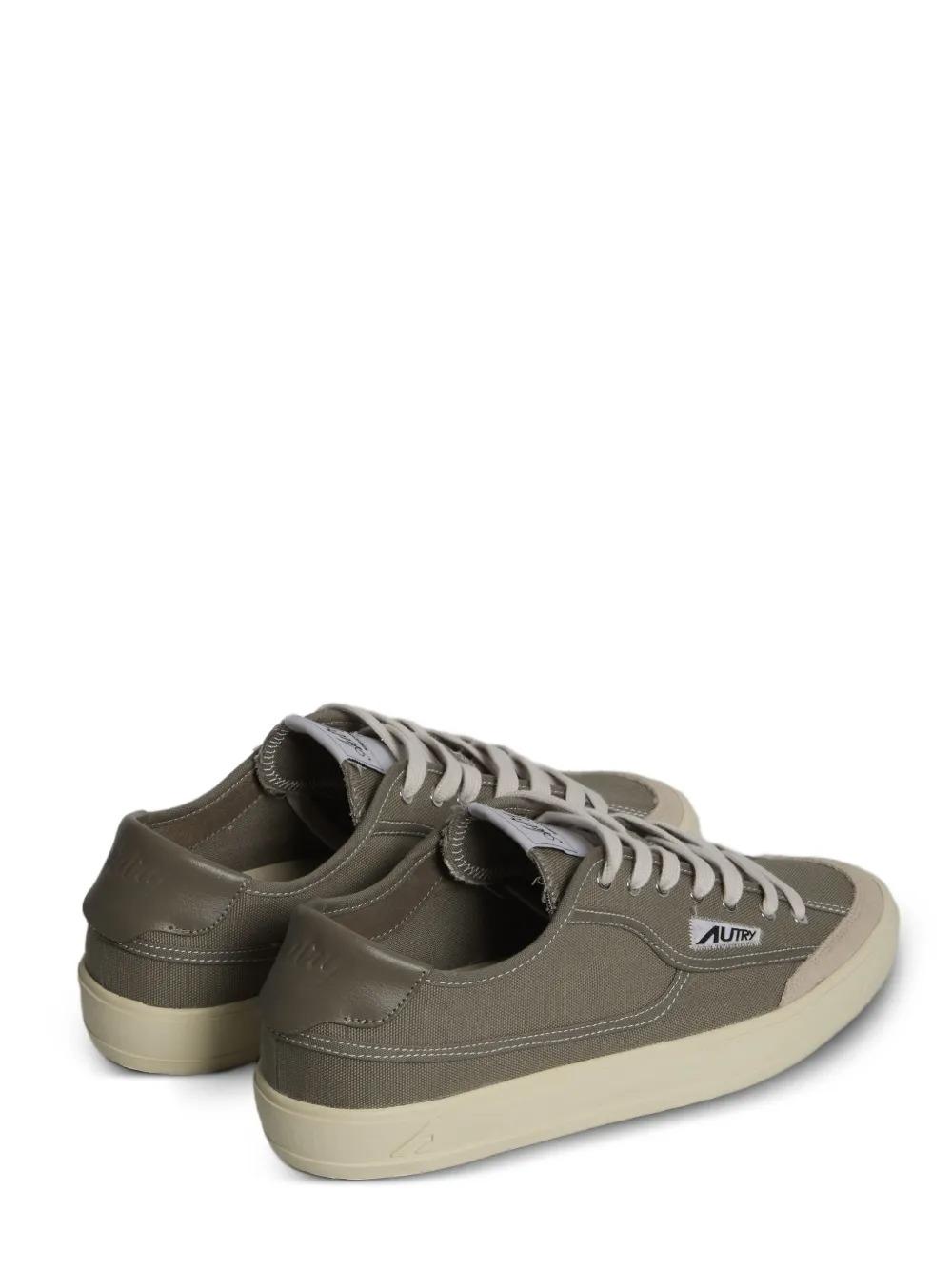 Sneakers verde militare Windscape di Autry in pelle e tela con linguetta sul tallone in pelle nera, inserti in pelle scamosciata, toppa con logo, punta arrotondata.