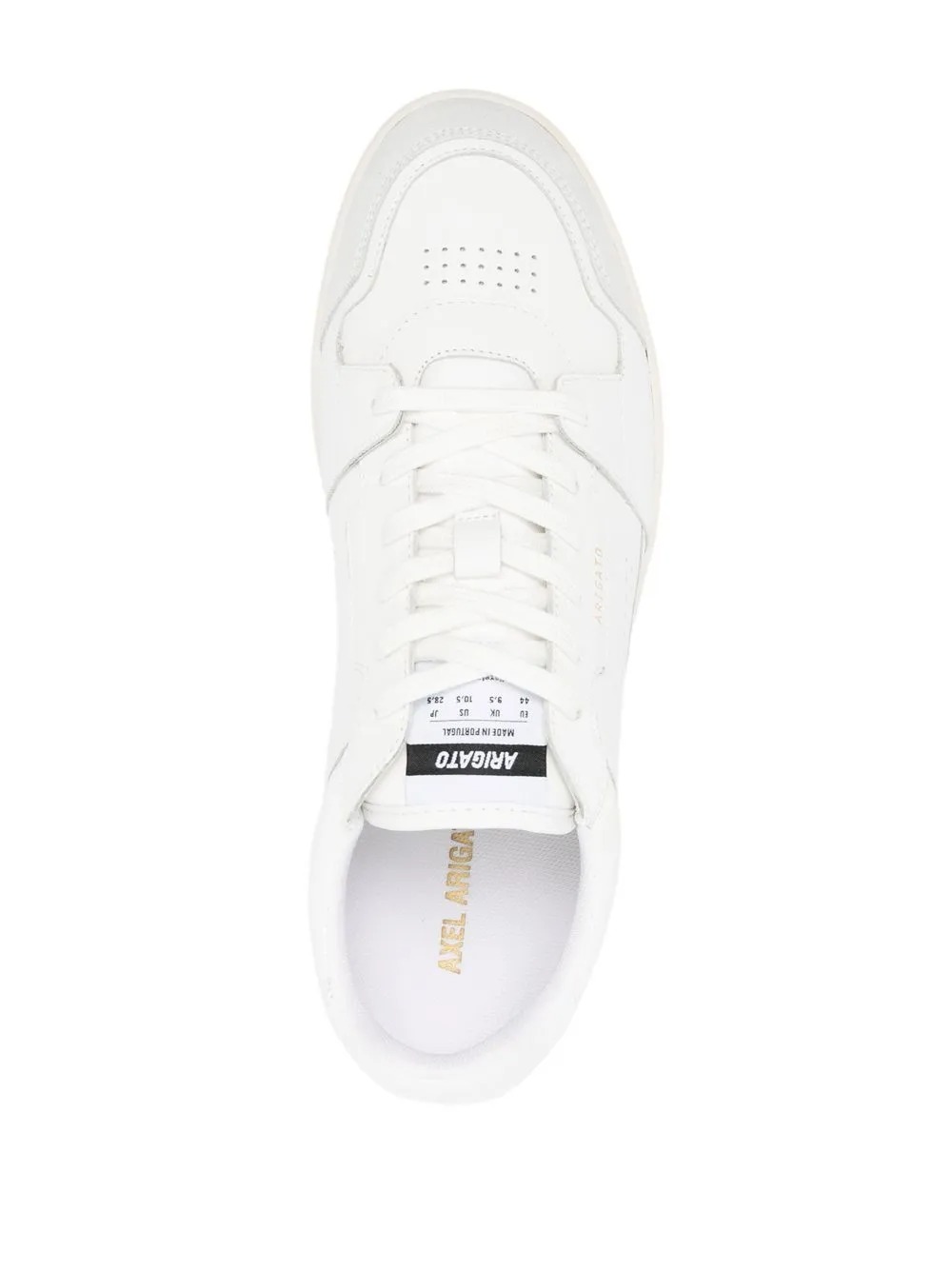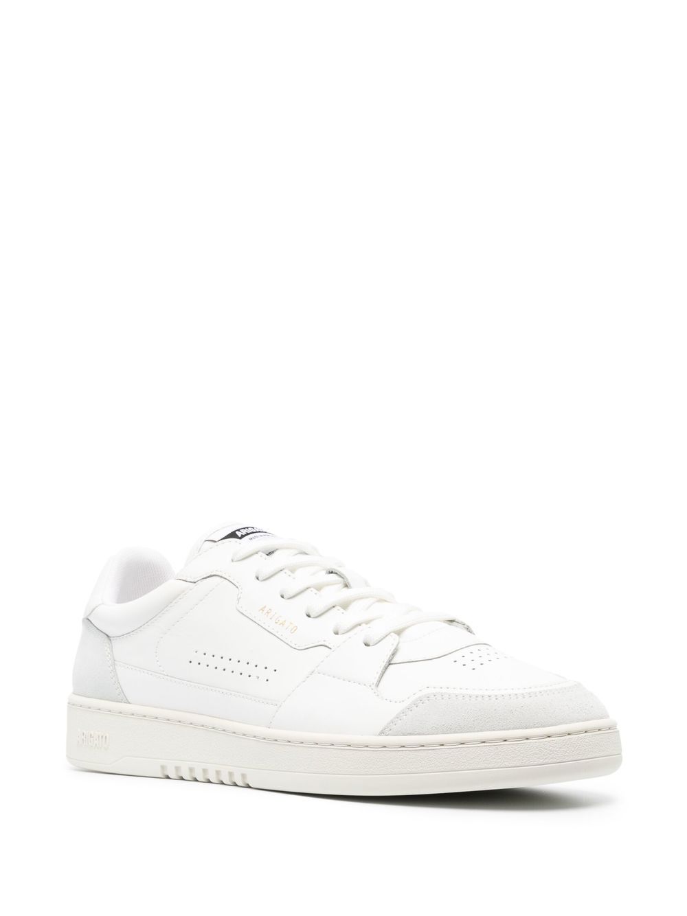Sneakers bianche Dice Lo di Axel Arigato in pelle con punta tonda, dettaglio laterale traforato, applicazione di pannelli in pelle scamosciata, logo patch sulla linguetta, chiusura frontale con lacci e suola piatta in gomma.