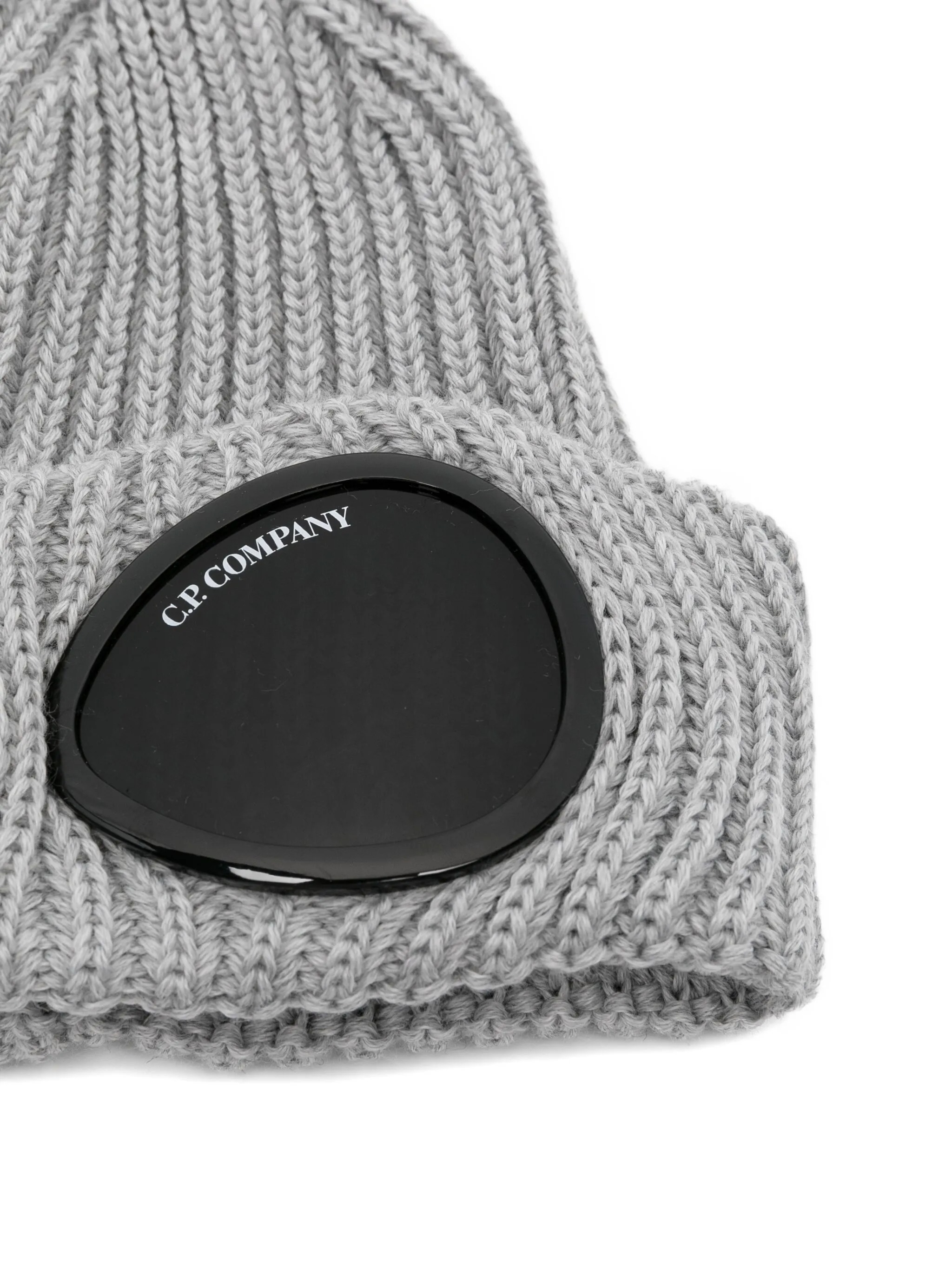 Cappello beanie grigio di C.P. Company in lana con lavorazione a coste, lenti google C.P. centrale e orlo con risvolto.