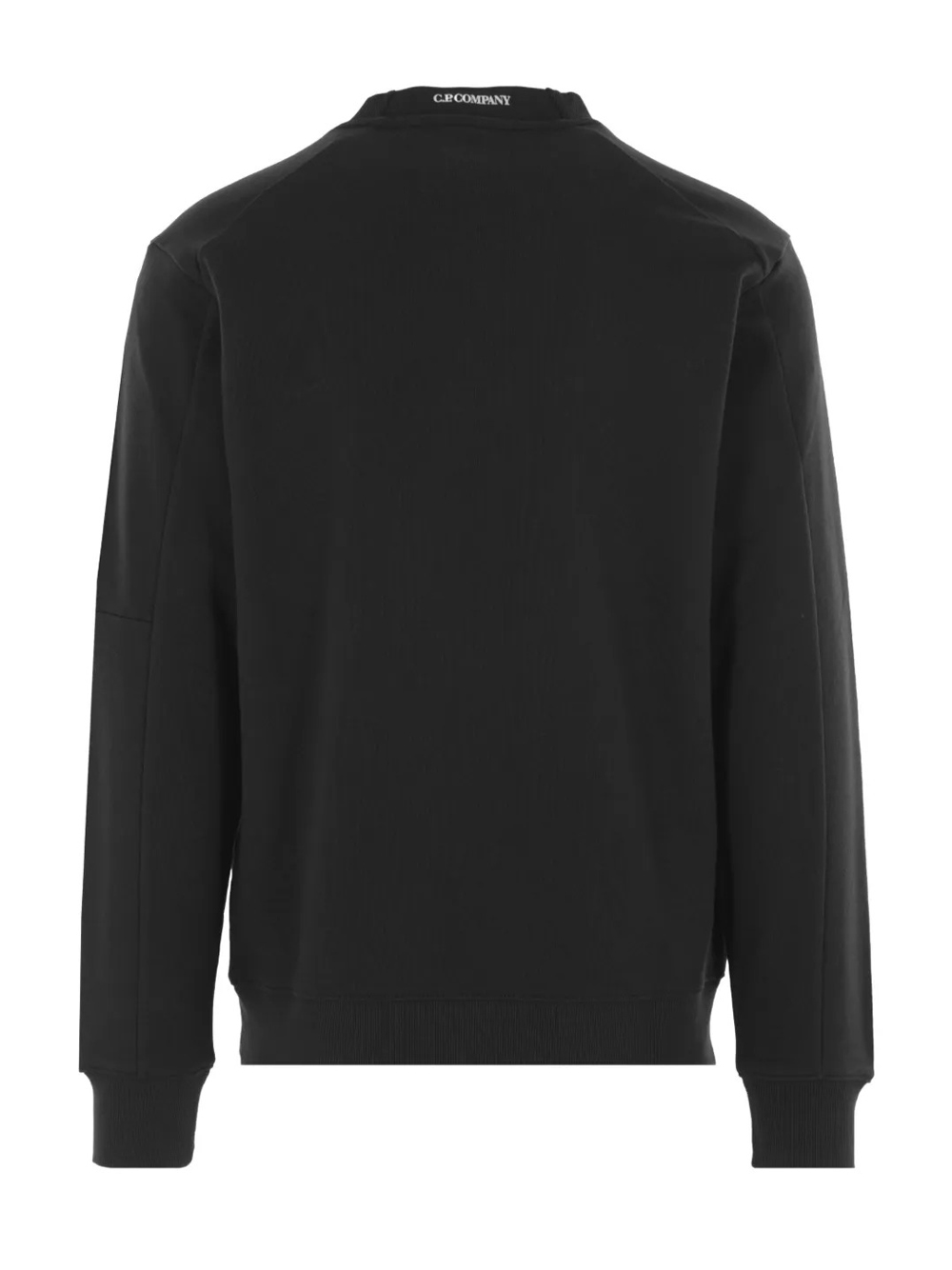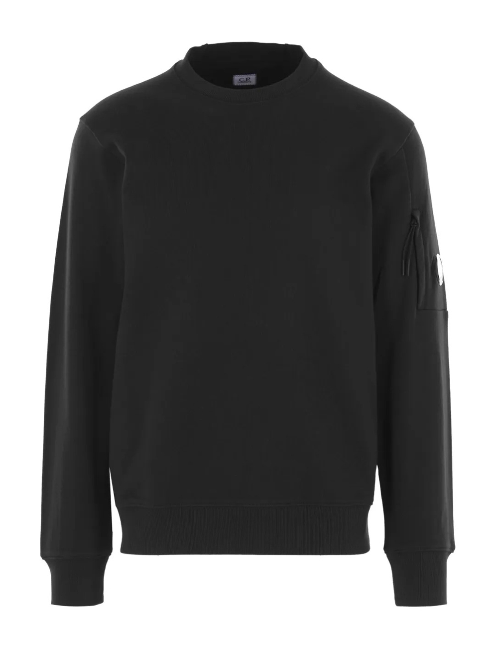 Felpa nera Diagonal Raised Fleece di C.P.Company in cotone con girocollo, dettaglio Lens, taschino laterale su manica e orlo dritto.