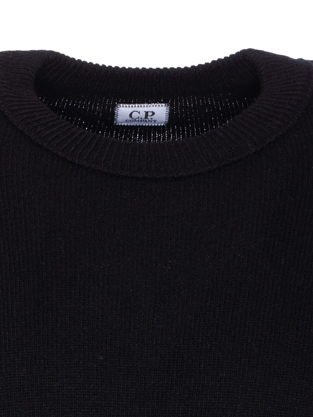 Maglione nero girocollo di C.P. Company in lana con lente C.P. sul braccio e orlo dritto.