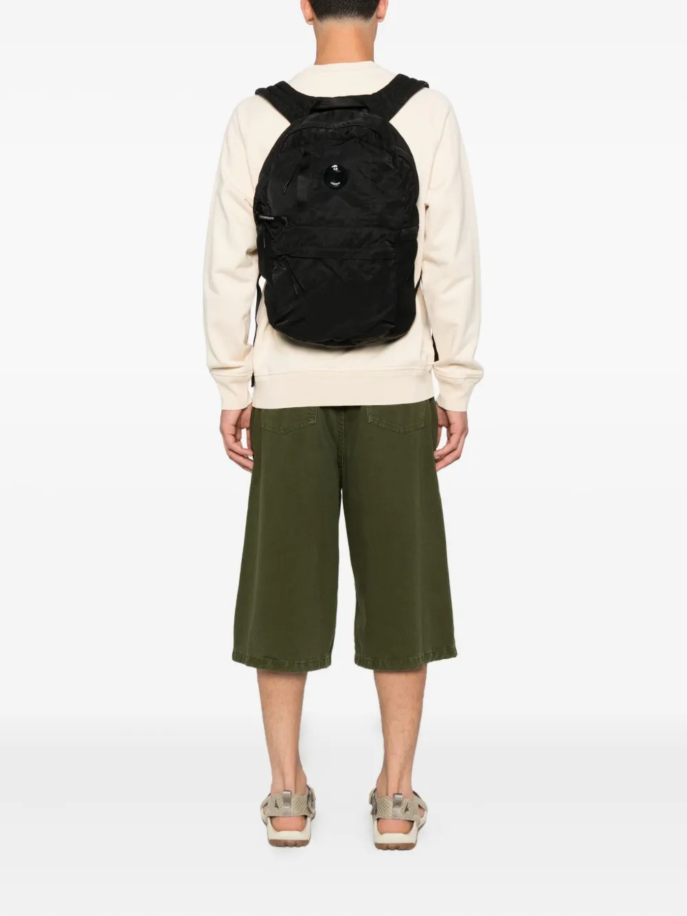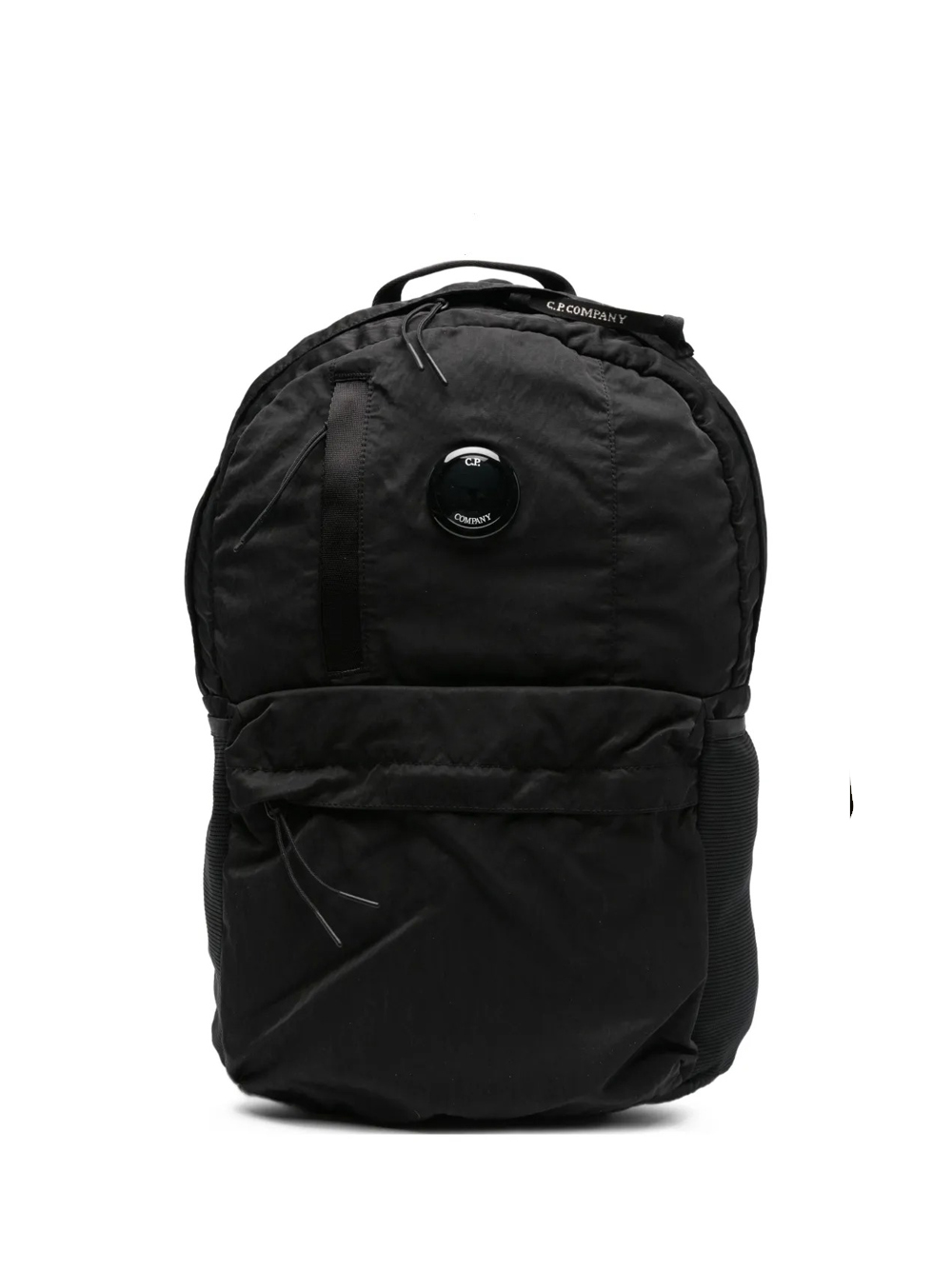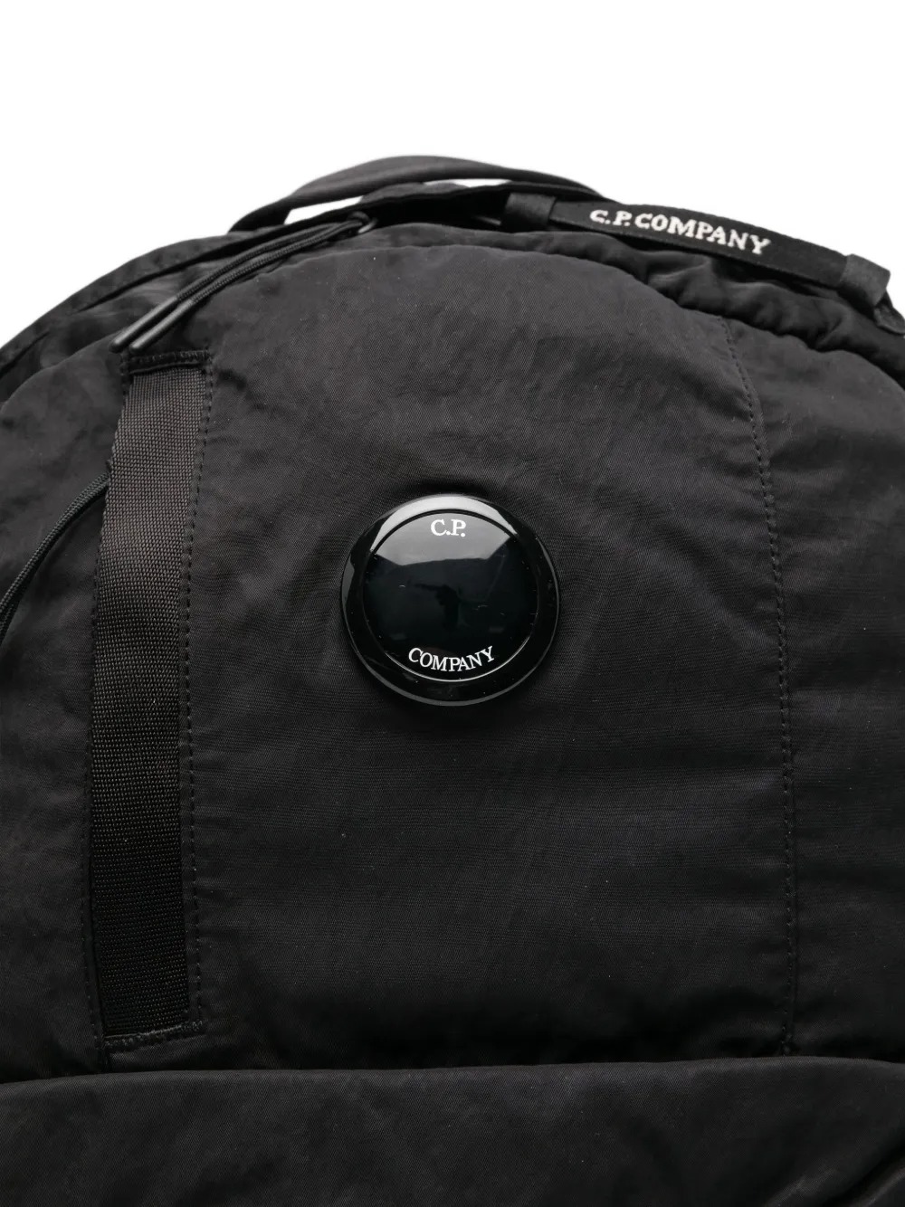 Zaino nero di C.P.Company in nylon con inserto posteriore trapuntato, manico, spallacci regolabili, dettaglio Lens e chiusura con zip.