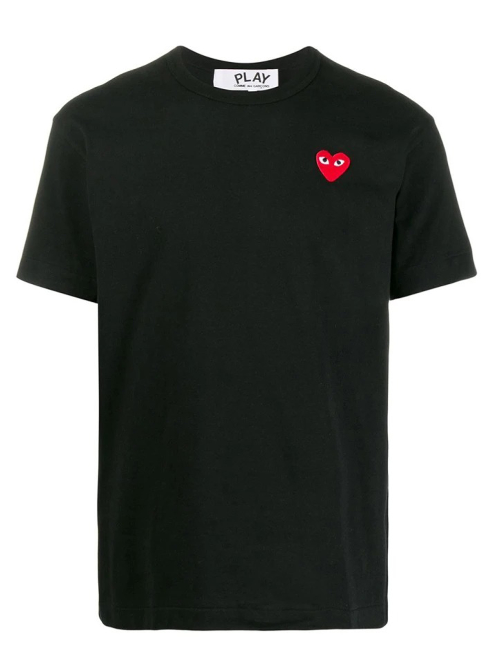 T-shirt nera Play di Comme Des Garçons Play in cotone con girocollo, logo nero ricamato sul petto e orlo dritto.