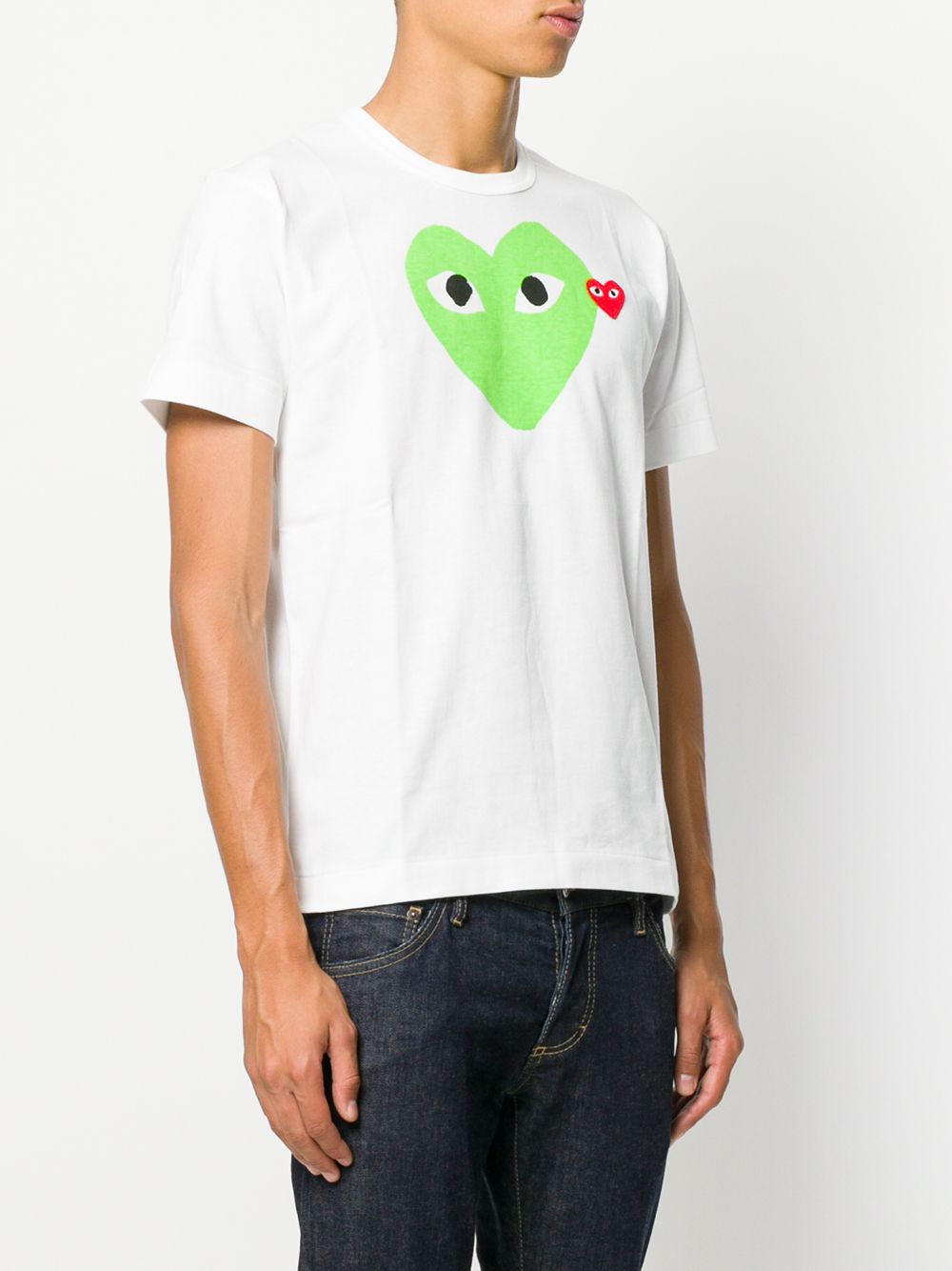 T-shirt bianca Play di Comme des Garçons Play a maniche corte in cotone con stampa cuore verde sul petto, girocollo e orlo dritto.