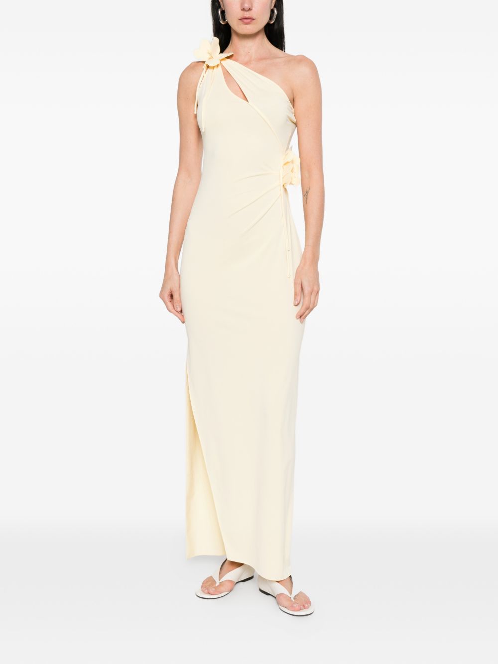 Abito giallo Asymmetric Flower Gown di Coperni in poliammide con design asimmetrico, applicazione a fiori, design monospalla e senza maniche.