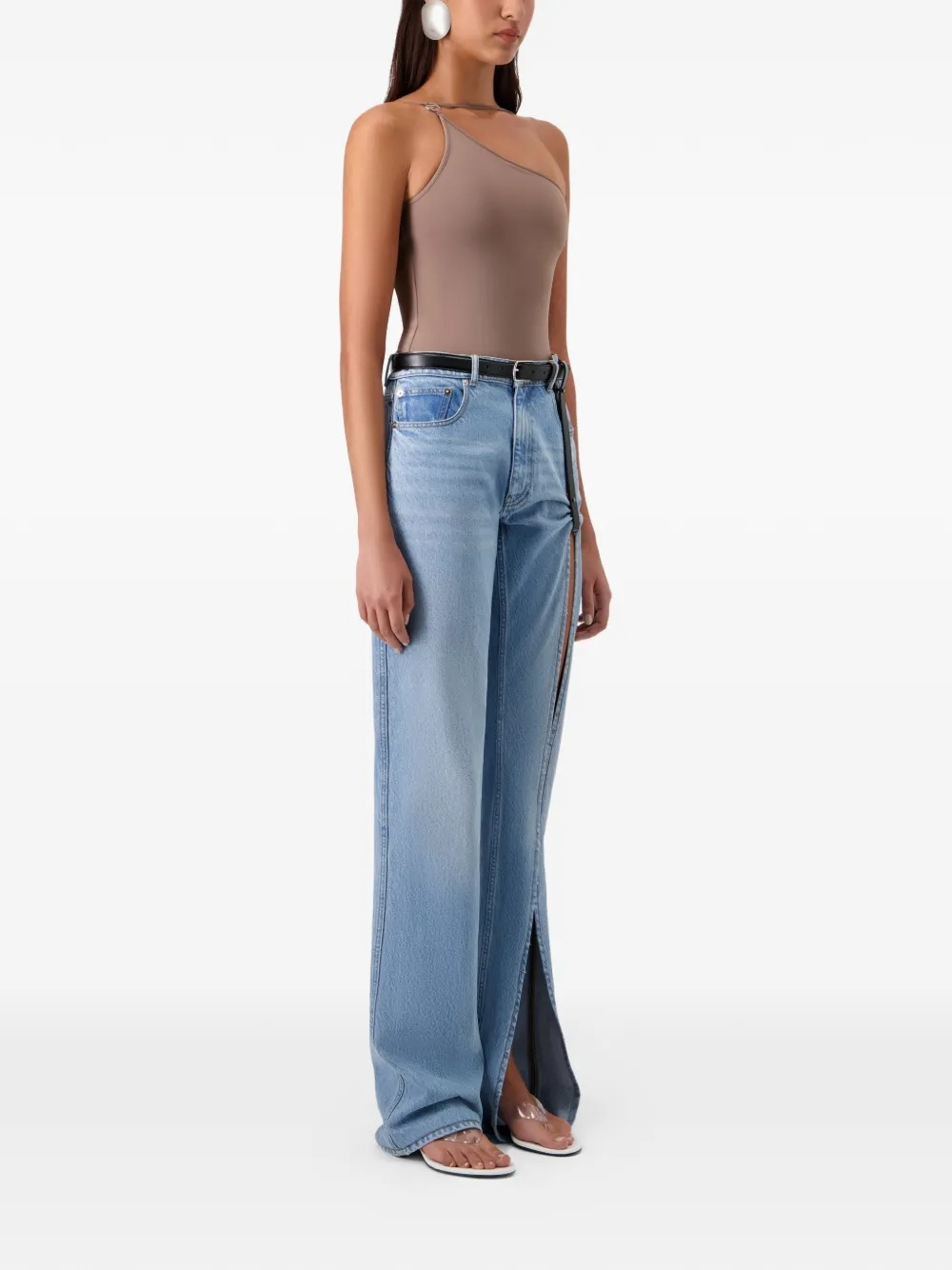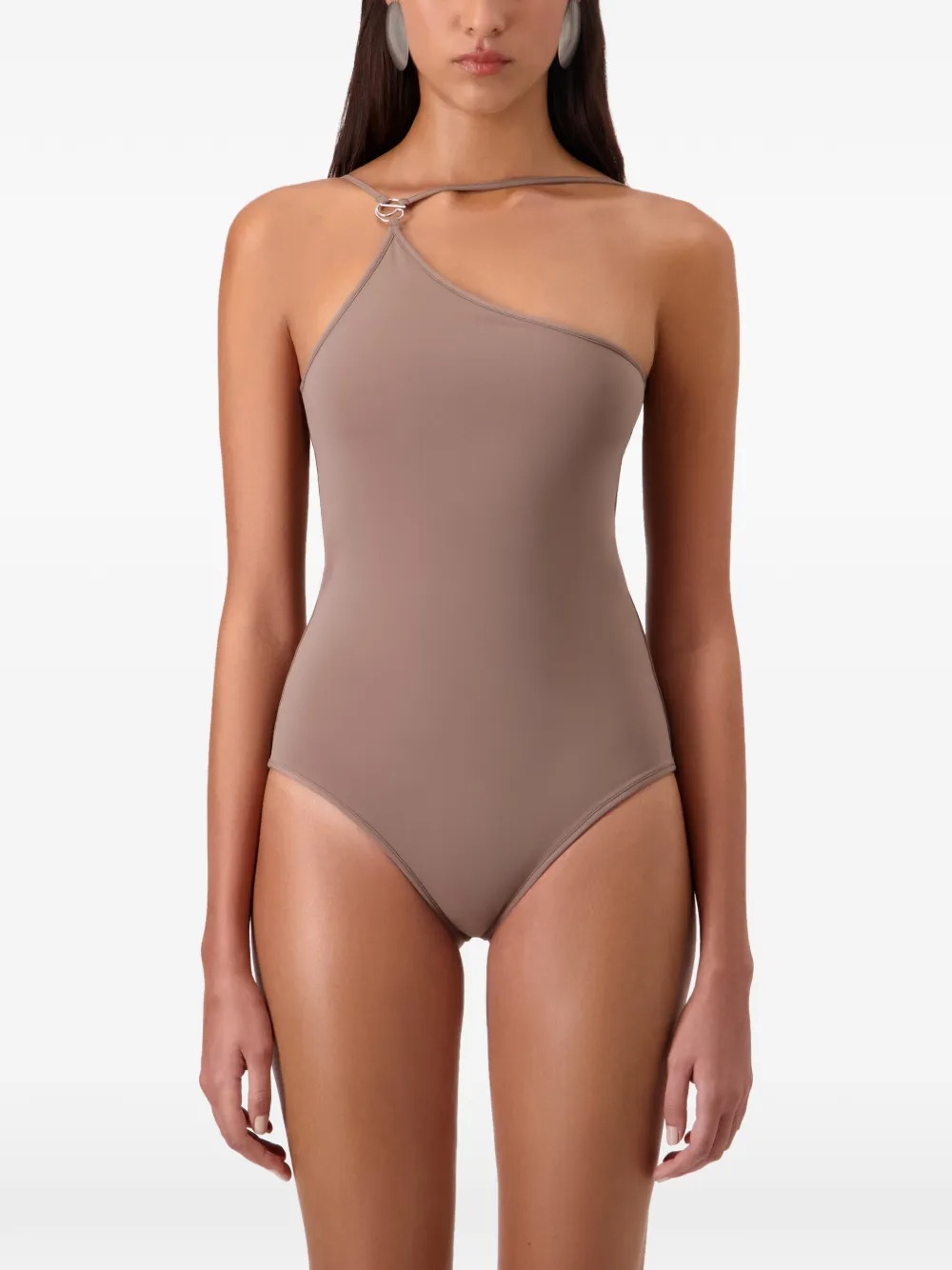 Costume marrone One Shoulder di Copernin in poliammide con monospalla con spalline sottili regolabili, dettaglio con logo Swipe e finiture color argento.