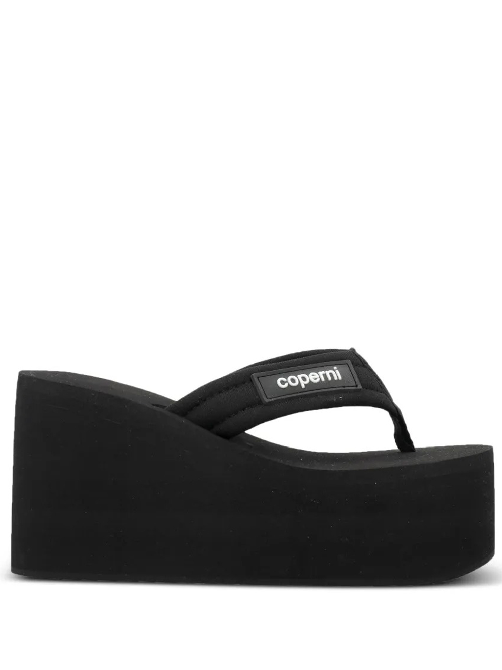 Sandali neri Branded Wedge di Coperni in tessuto con applicazione frontale con logo, fascia sull'alluce, design slip-on, tacco alto a zeppa e plateau.