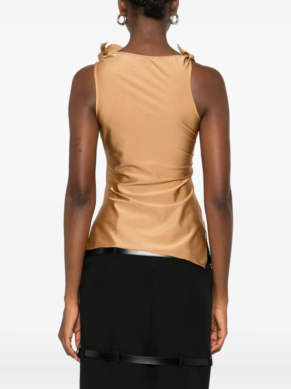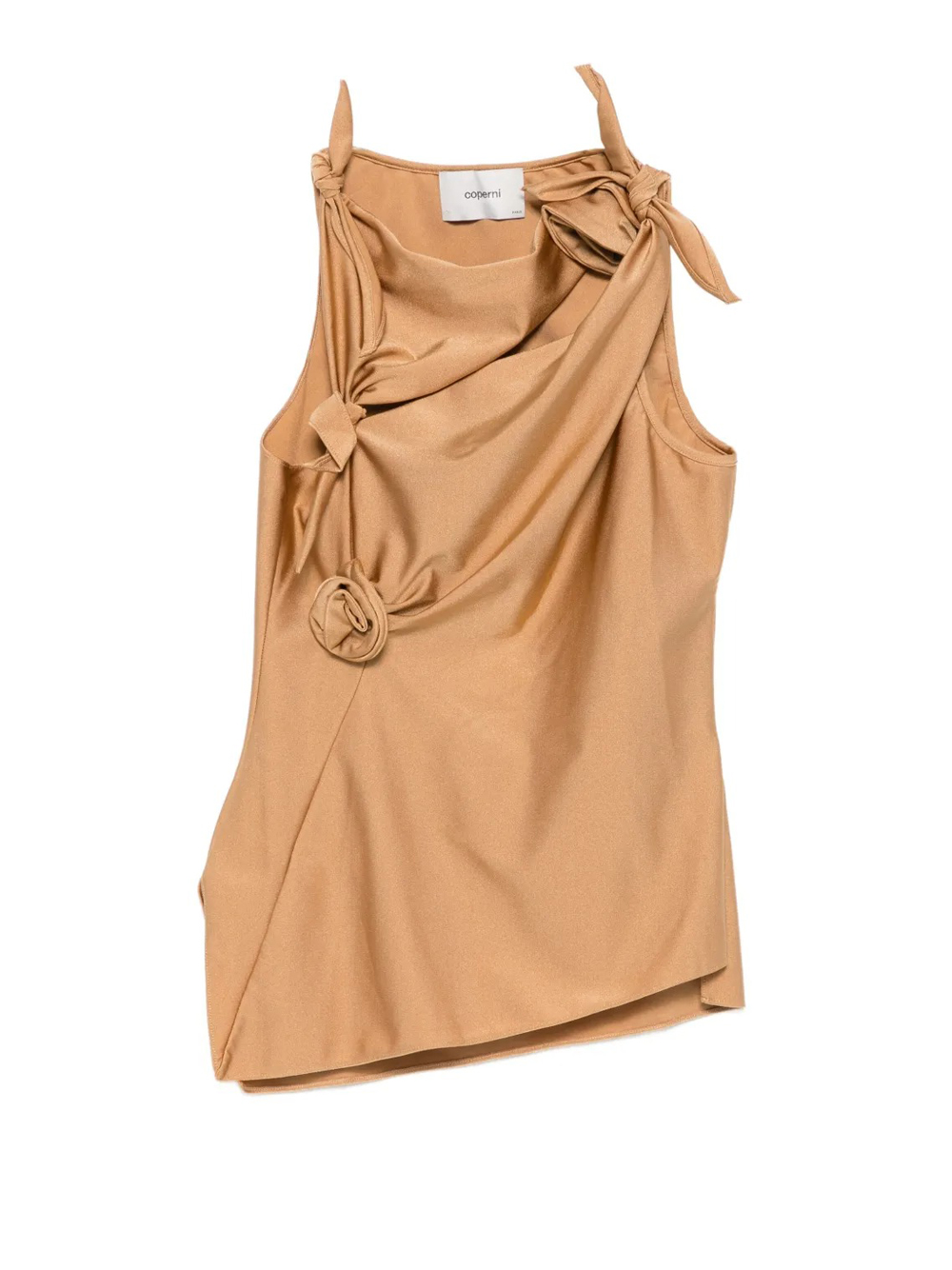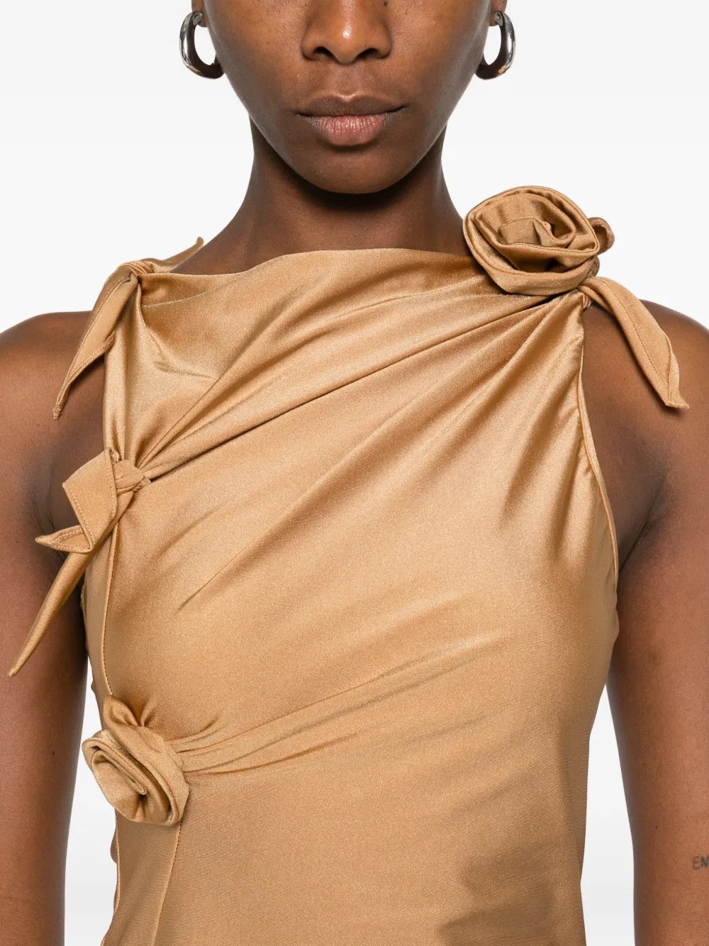 Top marrone Asymmetric Flower Gown di Coperni in poliammide con scollatura cut-out, applicazione rose in tessuto e taglio asimmetrico.
