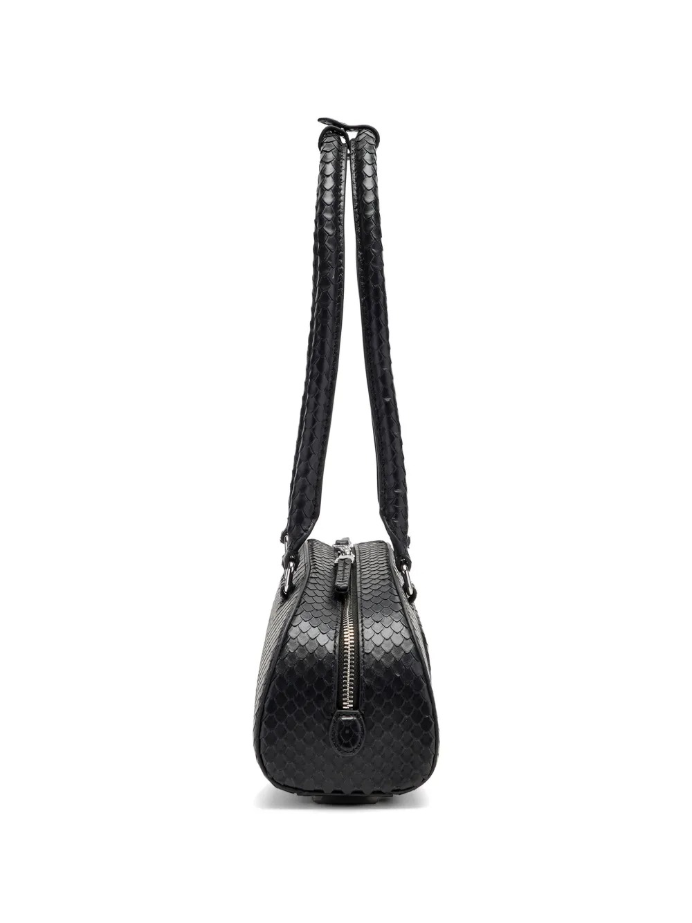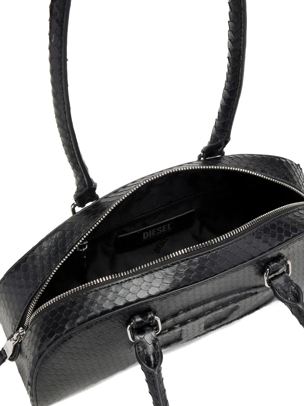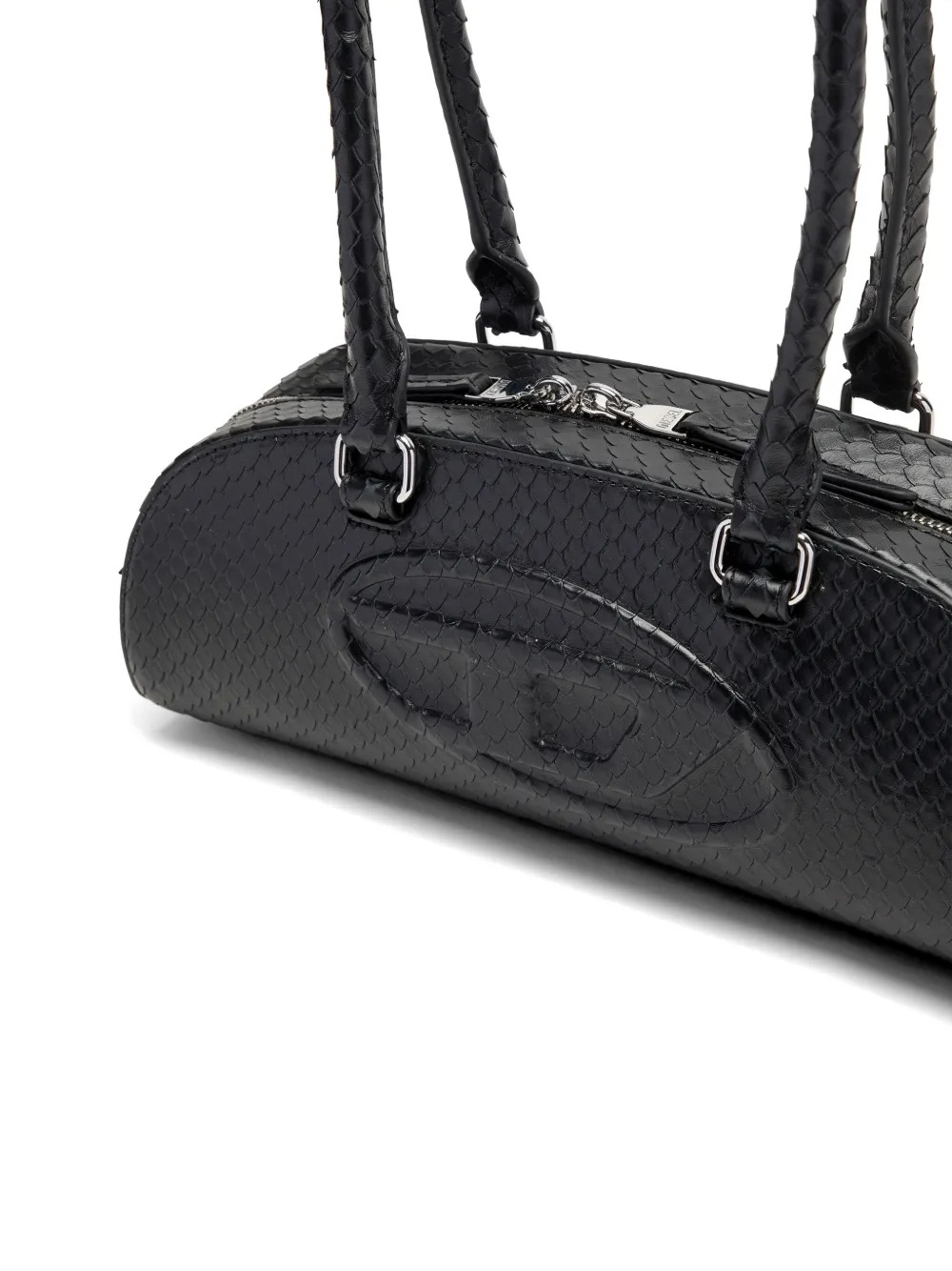 Borsa nera 1DR Dome Bowling di Diesel in pelle con effetto pelle di serpente goffrata, logo Oval-D, manici tondi, chiusura con zip a doppio cursore e scomparto unico.