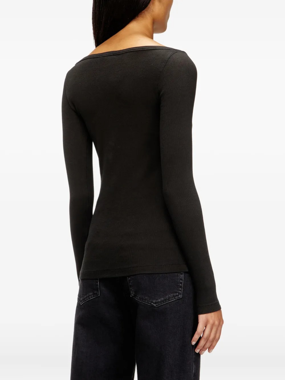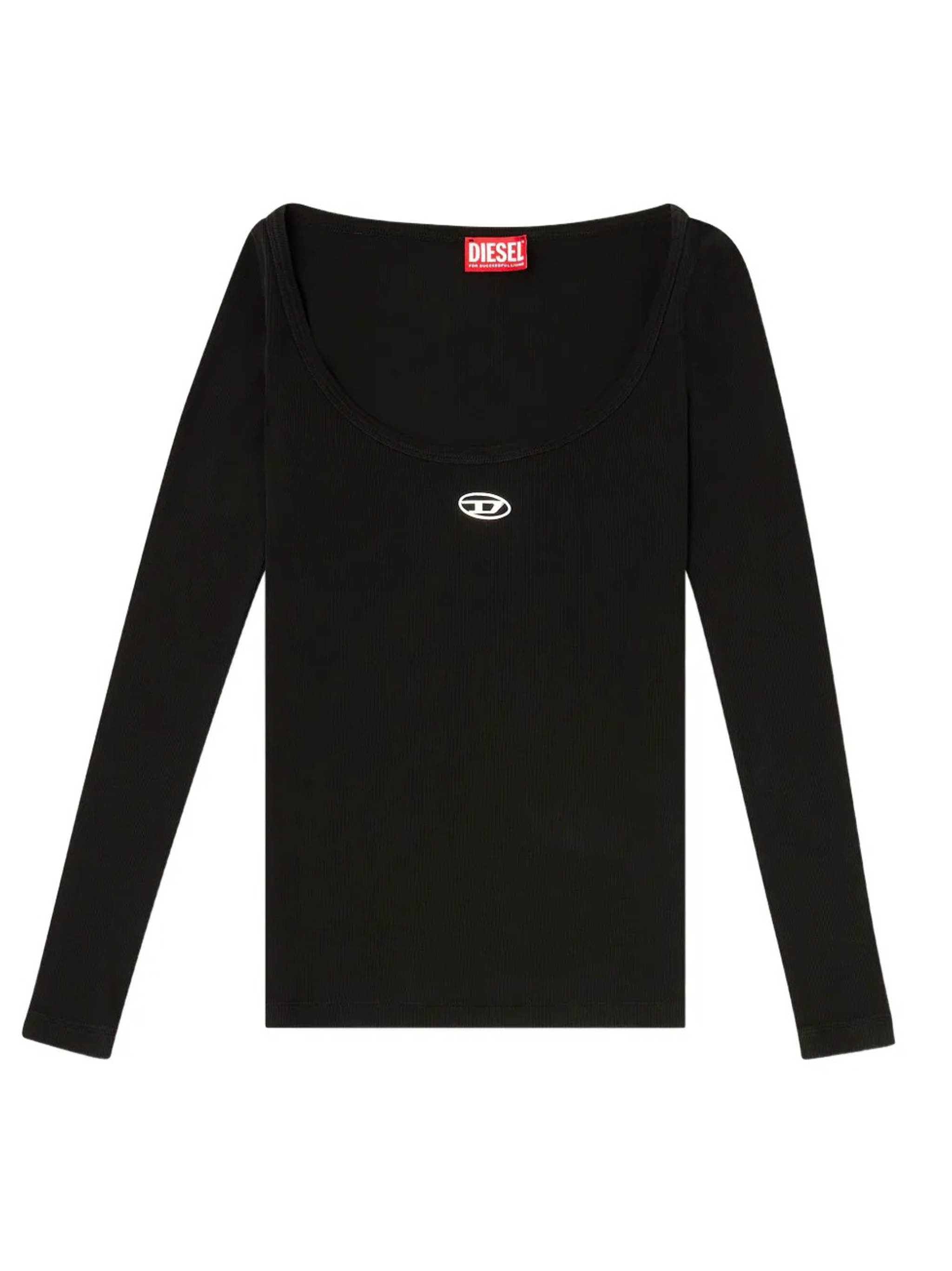 scollo rotondo, maniche lunghe e dettaglio logo.